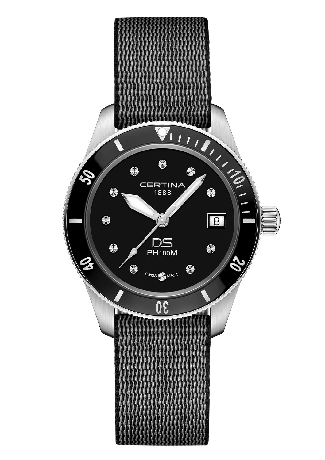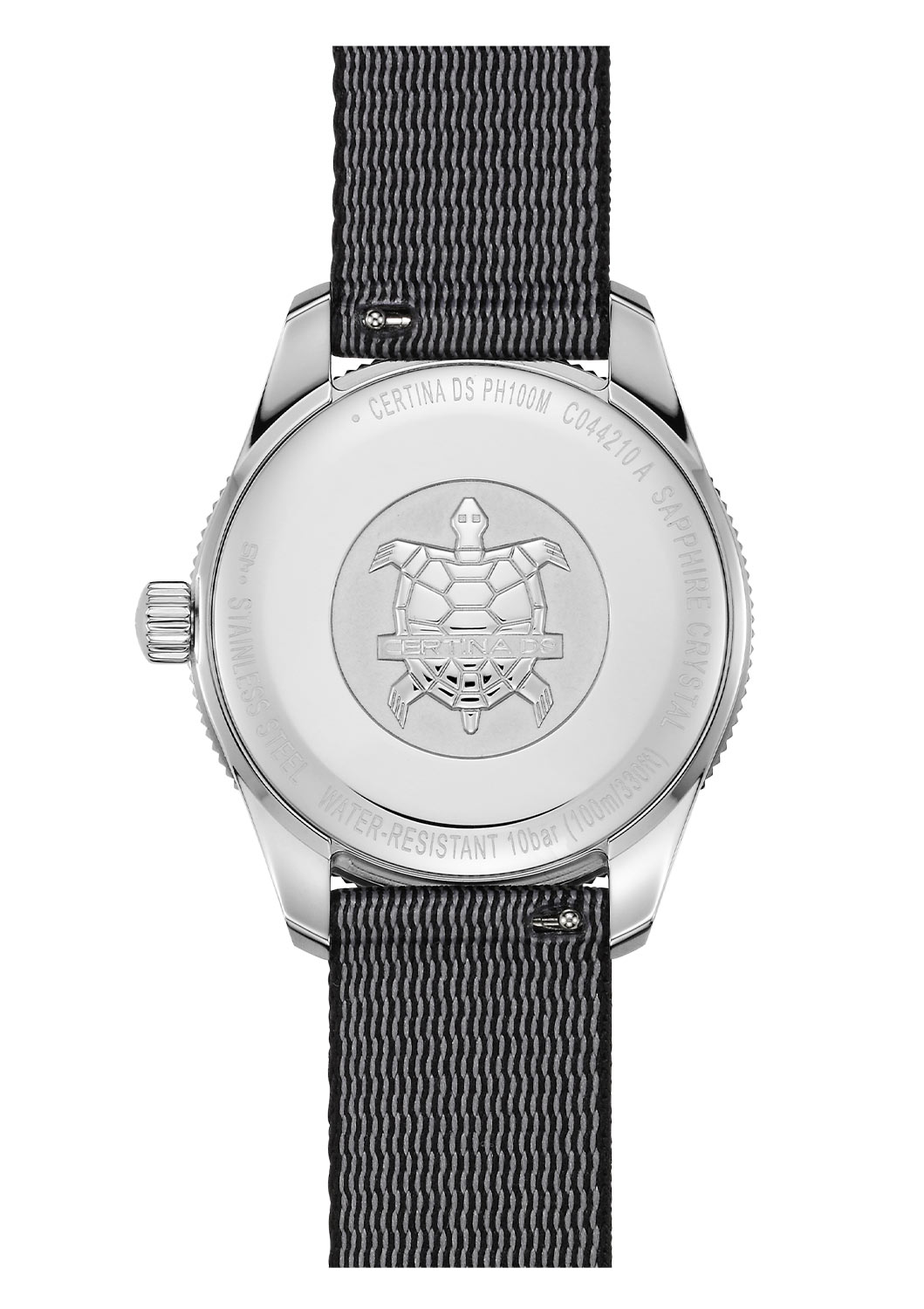 Hodinky Certina DS PH100M Lady C0442101805100 mají kulaté pouzdro z nerezové oceli. Pouzdro o velikosti 37,50 mm má vodotěsnost až 100 metrů, což umožňuje různé aktivity, včetně plavání. Pouzdro je obohaceno o otočnou lunetu s minutovou stupnicí. Korunka na pravé straně je velká a pohodlná na ovládání. Celou konstrukci uzavírá ocelové dýnko. Hodinky využívají patentovaný systém DS (Double Security) od značky Certina. Tento složitý systém těsnění chrání hodinky před prachem, bahnem nebo otřesy. Model je upevněn na pružném textilním řemínku #tide s tradiční sponou.