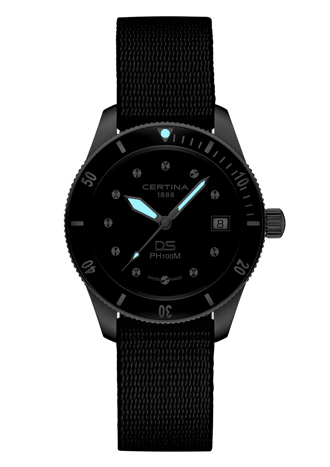 Sportovní dámské hodinky Certina C044.210.18.051.00 jsou zepředu chráněny safírovým sklíčkem odolným proti poškrábání s antireflexní vrstvou. Sklo chrání černý ciferník. Čas ukazují velké ručičky pokryté svítivou luminiscenční vrstvou Super-LumiNova®. Svítící značka je také na 12. bodě otočné lunety. Funkčnost ciferníku doplňuje okénko datumovky na třetí hodině. Na světlém pozadí je zobrazen aktuální den v měsíci. Vše pohání švýcarský mechanismus ETA Precidrive™, který je známý svou velmi dobrou prací. Strojek je vybaven užitečnou funkcí úspory energie. Když bude baterie vyžadovat výměnu, systém End Of Life zpomalí chod sekundové ručičky – bude se pohybovat každých několik sekund.
