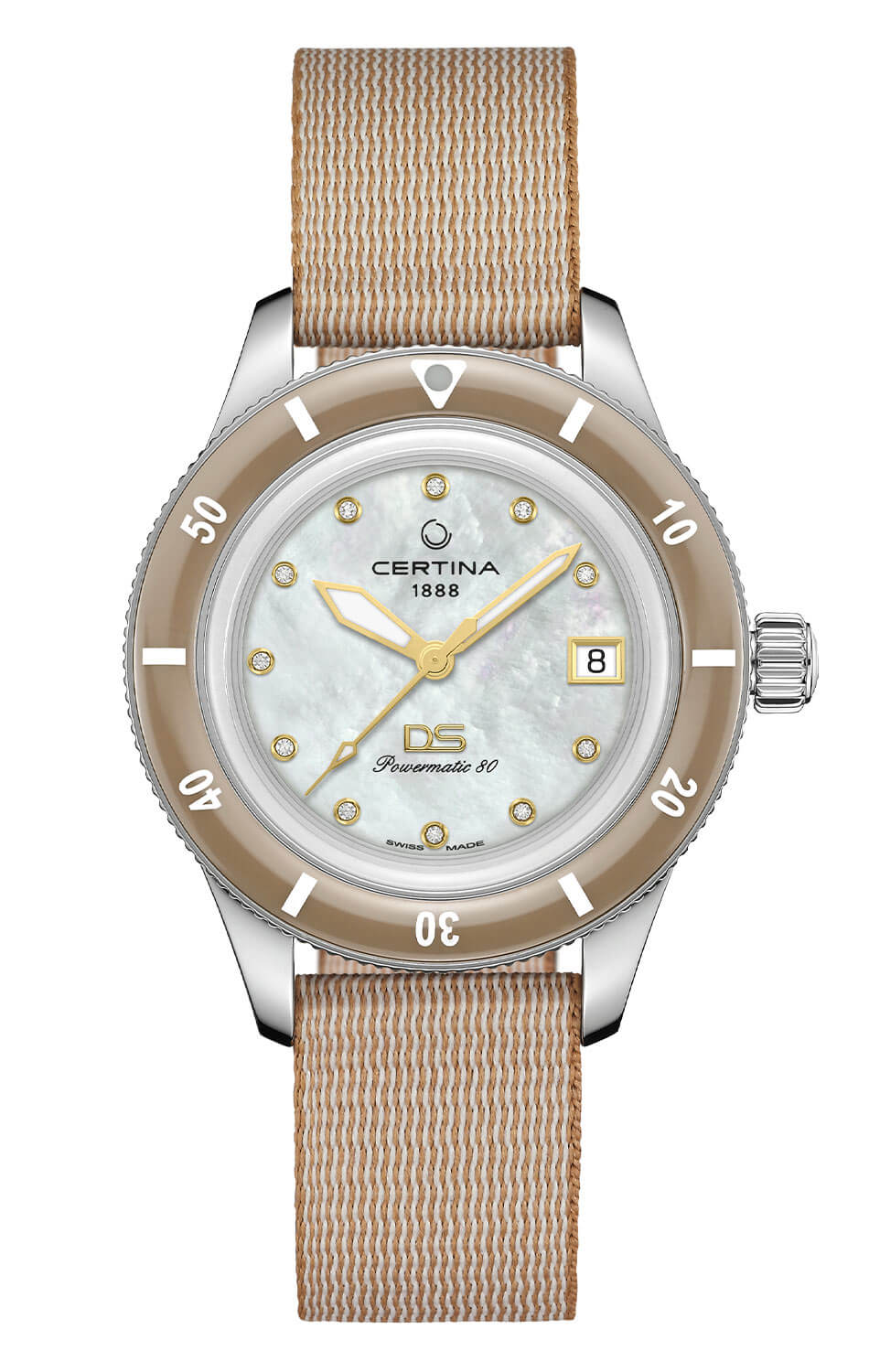 Perleť zdobící číselník tohoto modelu přitahuje pozornost jemnou hrou barev a odrazů – Certina DS PH200M Lady C036.207.18.116.00 na pásku NATO je časoměrem, který vyzařuje jedinečný přírodní lesk. Hodinové indexy byly ozdobeny jedenácti pravými diamanty, což z těchto hodinek činí také efektní šperk — každý pohyb zápěstí vyvolává třpytivý tanec světel na číselníku, jako by se slunce odráželo od mořské hladiny. Srdcem časoměru je inovativní automatický strojek Powermatic 80 s působivou rezervou chodu dosahující až 80 hodin. Tento švýcarský mechanismus je vybaven antimagnetickou pružinou Nivachron™, díky níž hodinky zůstávají odolné vůči vlivu magnetických polí a udržují si vynikající přesnost chodu. Potápěčské hodinky Certina DS PH200M Automatic Lady tímto způsobem dokazují, že elegance a luxus nejvyšší úrovně mohou jít ruku v ruce s funkčností a spolehlivostí – jde o časoměr, který stejně ohromuje vytříbeným vzhledem jako i svými výkony. Díky automatickému mechanismu hodinky nevyžadují baterii a zůstávají spolehlivé za všech podmínek.