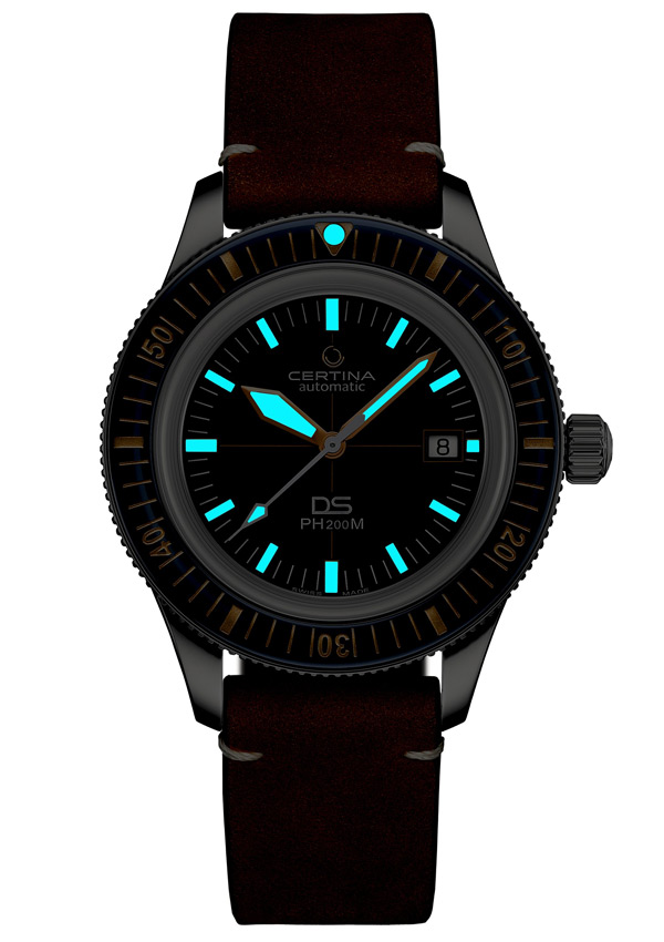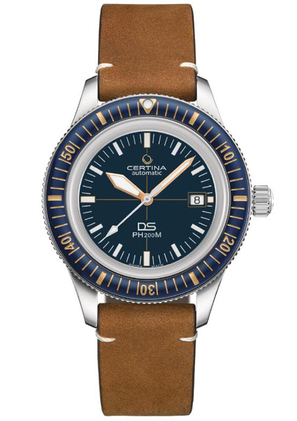 U této verze DS PH200M je pouzdro z nerezové oceli 42,8 mm doplněno konvexní otočnou lunetou z modré keramiky se zlatým indexem. Povrchová úprava Super-LumiNova® osvětluje modrý ciferník, zatímco ručičky a luneta zajišťují čitelnost i za zhoršených podmínek viditelnosti. Hodinky jsou opatřeny hnědým koženým řemínkem. Alternativní možnost k dispozici s černým rámečkem, černým PVD pouzdrem, hnědým páskem z teletiny Certina DS PH200M Powermatic 80 C036.407.36.050.00 černý rámeček, na milánském pásku Certina DS PH200M Powermatic 80 C036.407.11.000 na textilním a2 NATO Powermatic 201.0101 80 C036.407.18.040.00 . Díky použití rychlovýměnného systému lze řemeny snadno vyměnit.