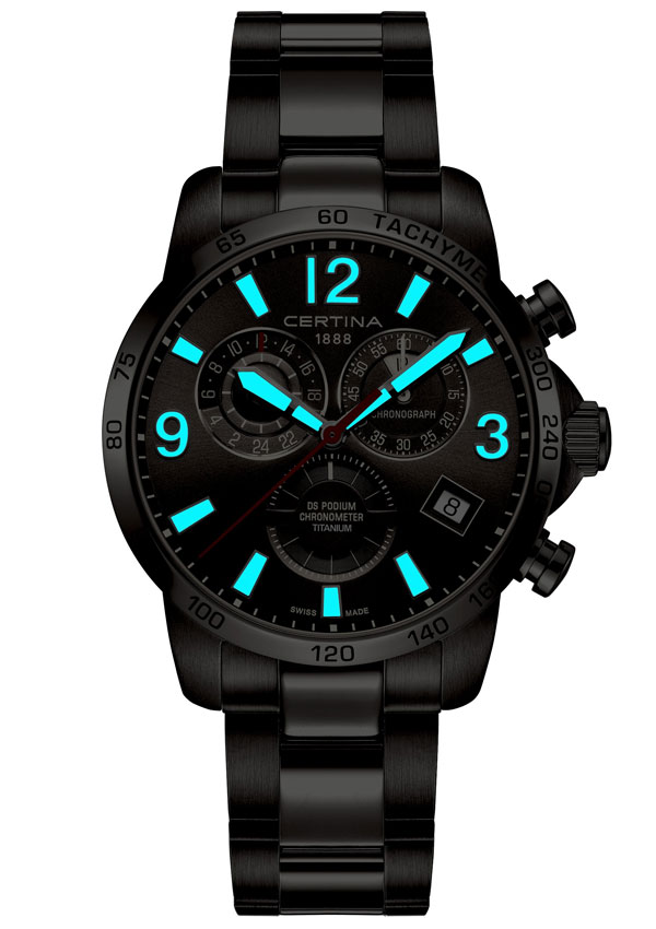 Vizuálně je chronometr Certina DS Podium Chrono GMT COSC nekompromisně sportovní v každém ohledu. Dynamický charakter má na svědomí mimo jiné výrazná stupnice tachymetru na mírně zkosené lunetě. 42mm titanové pouzdro obklopuje ciferník se stříbřitými indexy, které se na něm krásně třpytí. Ručičky hodin a minut jsou potaženy vrstvou Super-LumiNova®, jejíž luminiscenční vlastnosti stanovují tržní standardy a umožňují odečítání i v úplné tmě. Stejně jako u ostatních produktů CERTINA je nekompromisní švýcarská kvalita zdůrazněna známým bezpečnostním systémem DS - zárukou spolehlivosti a precizního provozu na dlouhou dobu.