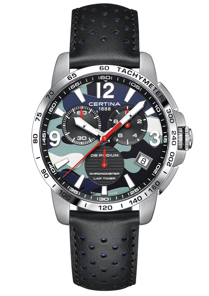 Po desetiletí je jméno CERTINA spojeno se závodním sportem. Dnes má podobu nekompromisních vojenských hodinek vybavených ciferníkem v camo barvách. Modrá, bílá, zelená a černá jsou barvy, které najdeme na číselníku. Skvěle ladí s černým páskem s modrými prvky. DS Podium Chronograph Lap Timer má nadprůměrně přesný quartzový Machineek Precidrive™ s chronometrem s certifikací COSC . Funkce chronografu jsou speciálně přizpůsobeny načasování závodů. Počítadlo kol vám umožňuje intuitivně měřit a přidávat časy kol pomocí několika jednoduchých operací. Celkové časy jsou zobrazeny na 60minutovém počítadle v 10 h. Počítadlo desetin ve 2 h nabízí údaje v reálném čase po dobu dvou celých minut, což je zhruba průměrný čas na kolo na trati.