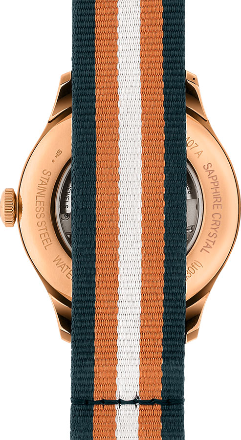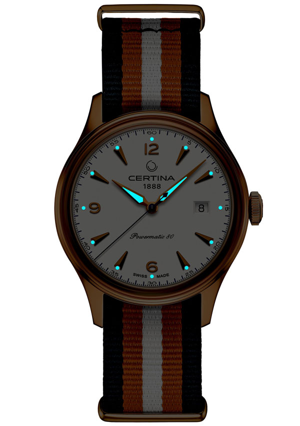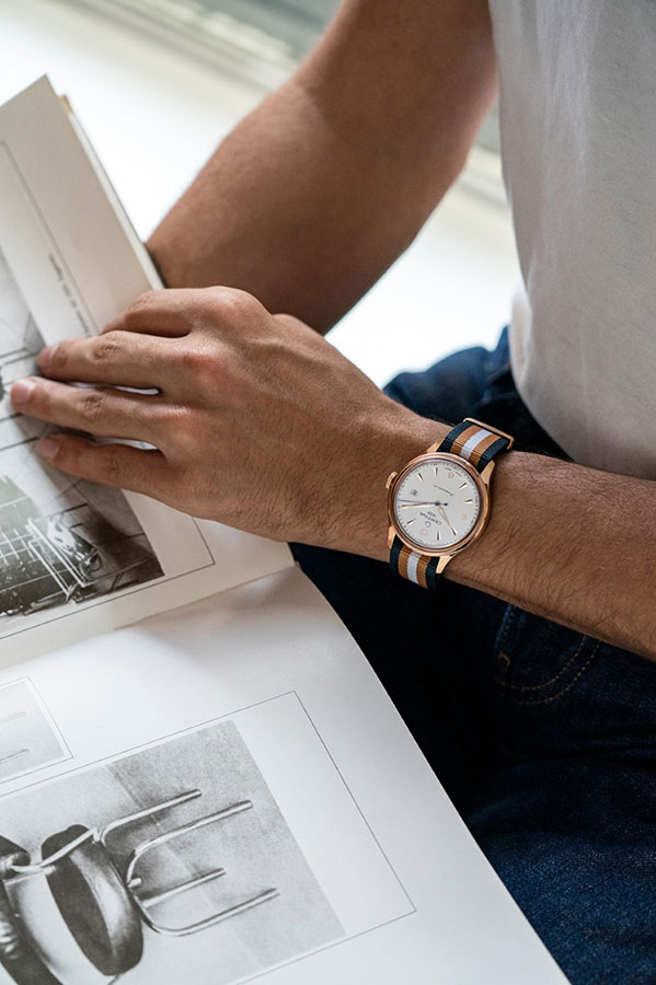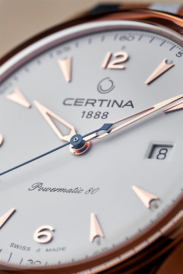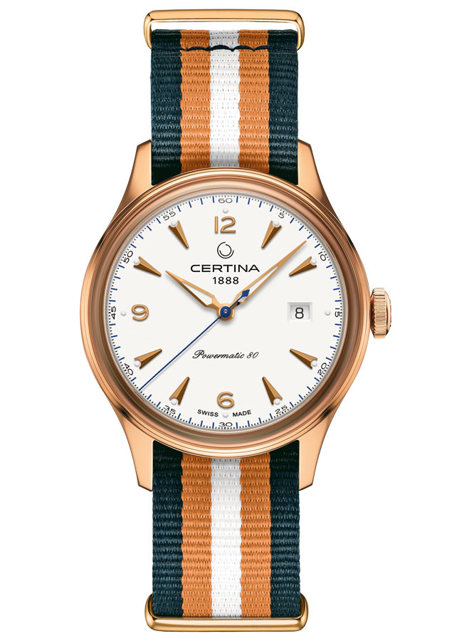 DS Powermatic 80 staví na svém oblíbeném předchůdci, DS Chronograph Automatic. Na rozdíl od něj má ale tříbodový ciferník a 40mm pouzdro z nerezové oceli s PVD úpravou v barvě růžové/žluté zlato. Safírové sklíčko poskytuje optimální pohled na ciferník a navíc evokuje vzpomínky na historické hodinky. S ručně vyráběnou přesností rafinované komponenty pozdvihují vintage pocit: štíhlá pozlacená vteřinová ručka a minutová a hodinová ručka jsou pokryty švýcarským luminiscenčním povlakem Super-LumiNova®. Mírně vypouklý ciferník je zbarven leskle bílou. Jako módní a dynamický akcent se jeví NATO řemínek s bílými, modrými a hnědými pruhy, který lze díky systému rychlé výměny kdykoliv sejmout a vyměnit.