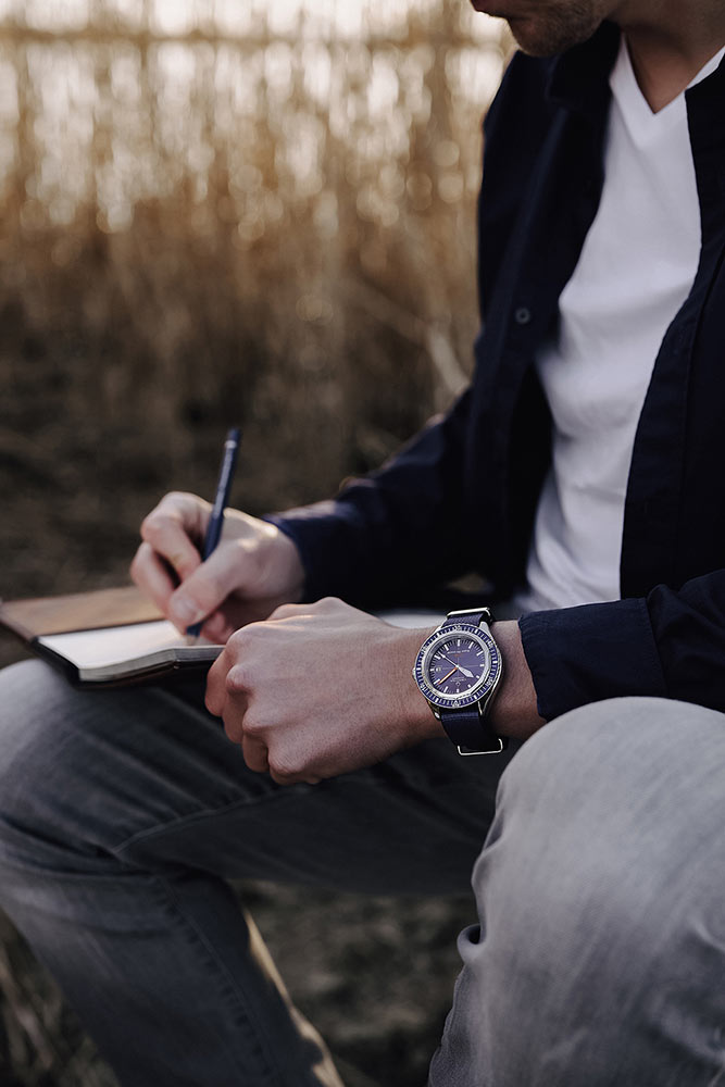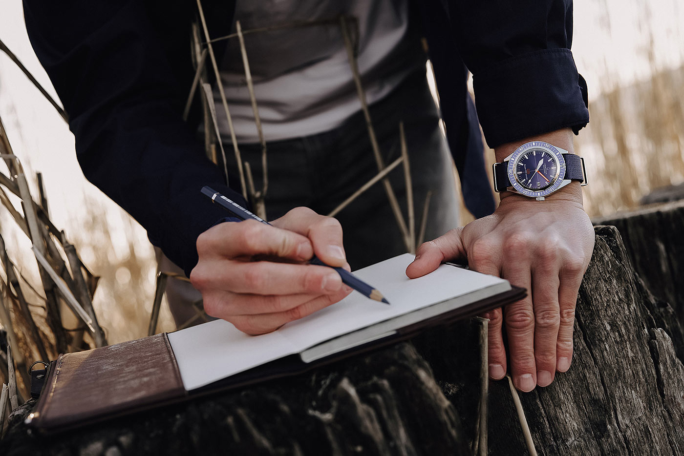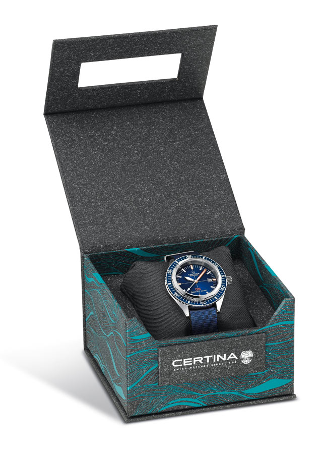 Nová Certina DS Super PH500M zůstává po stránce designu věrná svým kořenům. Charakteristickým prvkem je jednosměrně otočná luneta. Chcete-li jej otočit, musíte jej současně stisknout. Tato ochrana má zabránit náhodné změně aktuální doby ponoru. Ocelové pouzdro o průměru 43 mm je osazeno safírovým sklíčkem odolným proti poškrábání. Silná vrstva luminiscenčního materiálu zajišťuje jasnost indikací a díky použití šroubovacího zadního pouzdra a šroubovací korunky jsou hodinky vodotěsné do 500 metrů . Hodinky mají modrý NATO řemínek vyrobený z #tide ocean material® , což je recyklovaný plastový odpad získaný z oceánu.