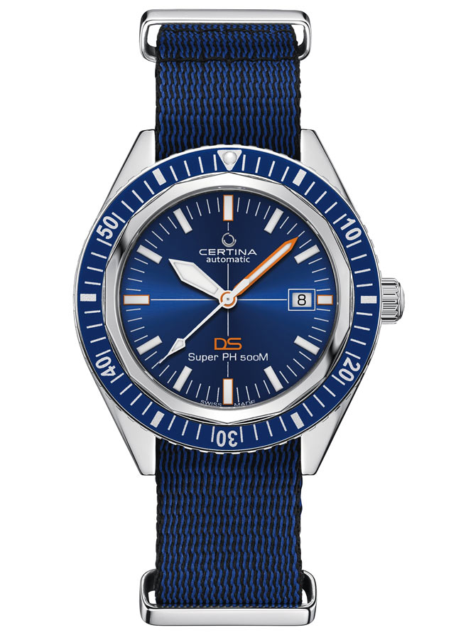 Senzační DS Super PH500M v retro stylu s modrým ciferníkem s protínajícími se linkami přitáhnou zraky všech fanoušků hodinek. Hodinky byly inspirovány diverským modelem Certina z roku 1968 . Aktuální DS Super je plně funkčním společníkem pro průzkum pod vodou. Vysoká třída těsnosti 50 bar - 500 m, odolnost vůči magnetickému poli, díky silikonové vlásence Nivachron™ .