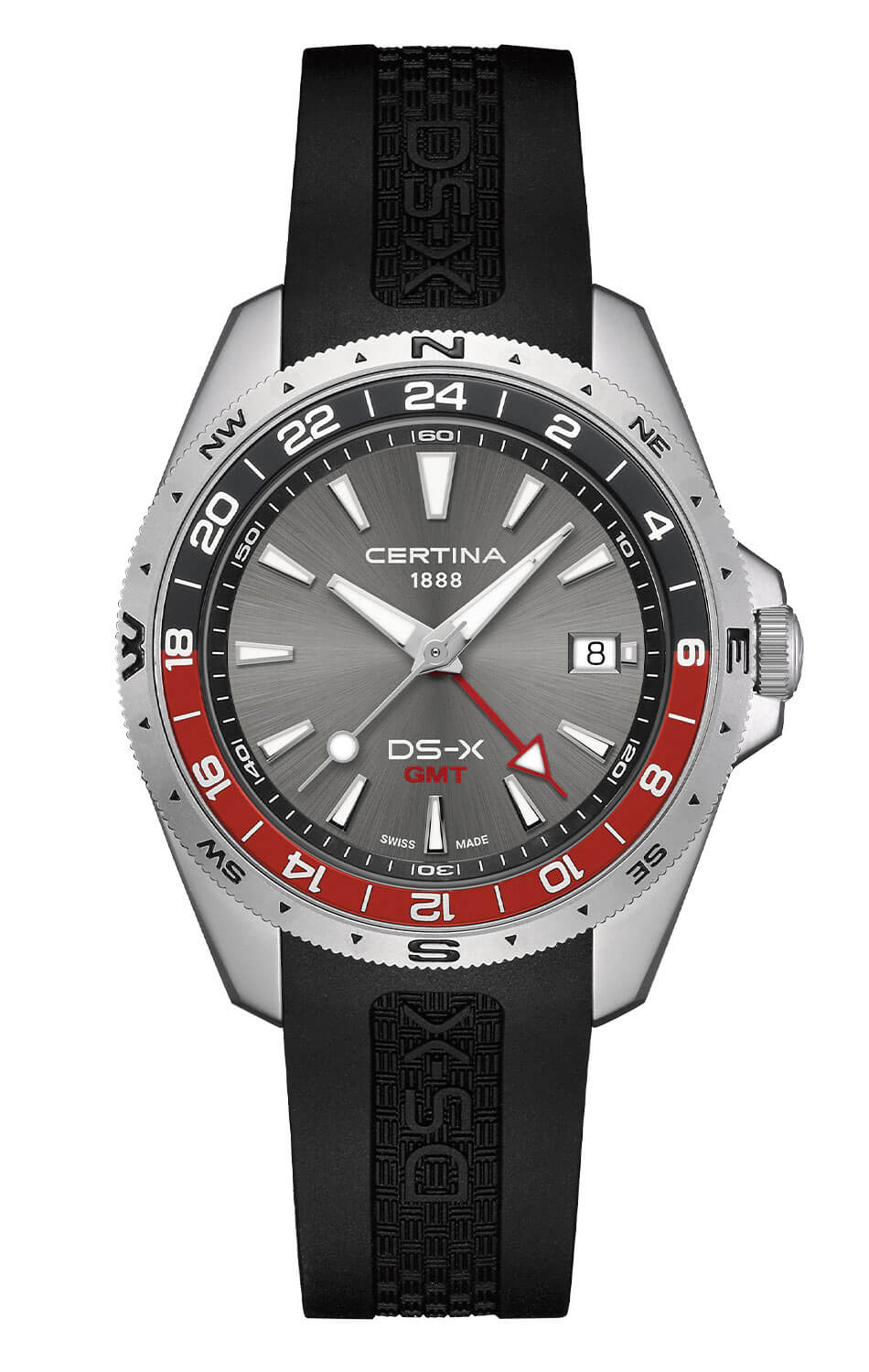 Číselník v odstínu kartáčovaného grafitu si zachovává perfektní čitelnost díky kontrastním indexům a ručičkám pokrytým luminiscenční hmotou Super-LumiNova®. Červená GMT ručička a dvoubarevná luneta podtrhují dynamický styl modelu. O spolehlivý chod se stará švýcarský strojek Ronda, zatímco datumovka na třetí hodině jemně doplňuje rozvržení. Hodinky s druhým časovým pásmem Certina C047.452.17.081.01 na gumovém pásku nejsou těmi, kdo sledují trendy – ony jdou přesně opačným směrem. Robustní, moderní a připravené na všechno.