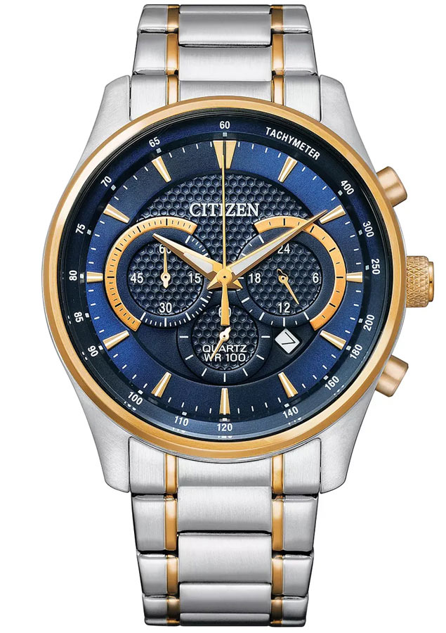 Citizen Quartz Chrono AN8194-51L jsou hodinky s vysokou funkčností, působivou úrovní zpracování a kvality a dynamickým sportovním designem. Pouzdro o průměru 42 mm zdobí pozlacené prvky, které dokonale ladí s pozlacenými ručičkami a fixy na číselníku. Bateriový Machineek quartz je kromě měření času a data vybaven chronografem, stopkami a 24hodinovým ukazatelem času. Vysoká třída těsnosti 10 bar/100 m umožňuje s hodinkami plavat a zajišťuje to šroubovací pouzdro.