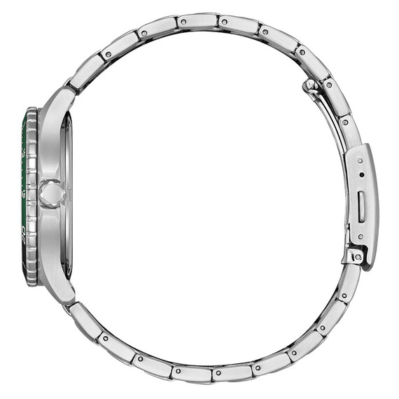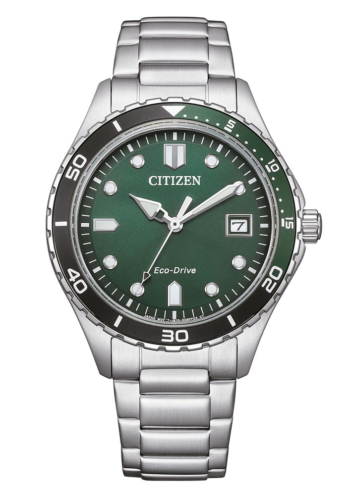 Pevný ocelový náramek rozepínací na knoflíky mu dodává nejen moderní charakter, ale také zaručuje odolnost v náročných podmínkách. Zelený ciferník je extrémně čitelný, perfektní jak u bazénu, tak i během večerů. Indexy a ručky hodinek jsou potaženy luminiscenční látkou, která zajišťuje skvělou čitelnost za zhoršených světelných podmínek. To je užitečné zejména při potápění nebo ve tmě. Ručičky mají charakteristický tvar hrotu kopí, který hodinkám dodává ostrý, sportovní a dynamický vzhled.