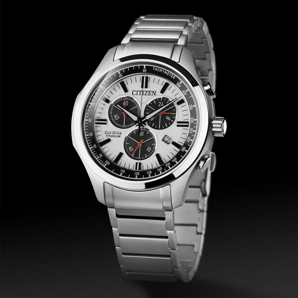 Pánské sportovní hodinky Citizen Sporty Chronograph AT2530-85A vyrobené z moderního titanu - Super Titanium . Materiál patentovaný japonskou značkou, který se vyznačuje neuvěřitelným komfortem nošení. O 40% lehčí než ocel, hypoalergenní, extrémně pevný a odolný 5x tvrdší než nerezová ocel. Většina značek hodinek používá titan v šedé barvě, zatímco Super Titanium je barevně podobné nerezové oceli, která vypadá efektněji.