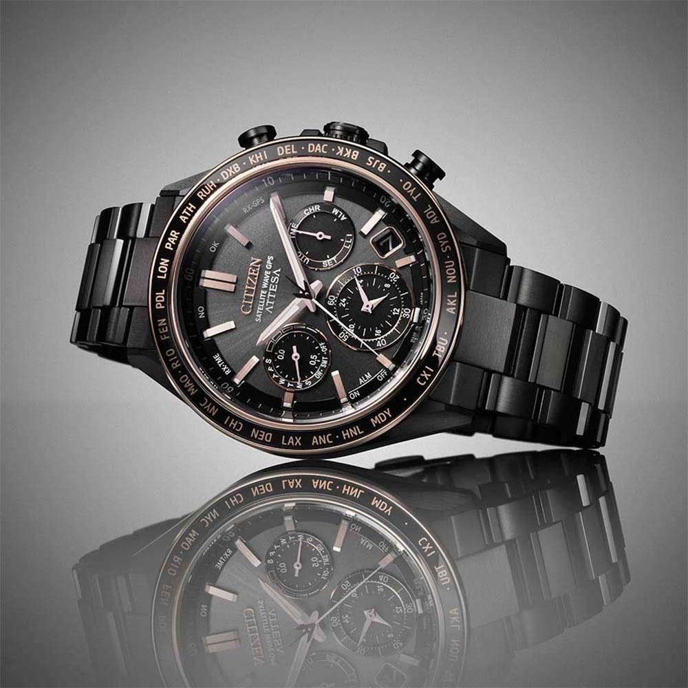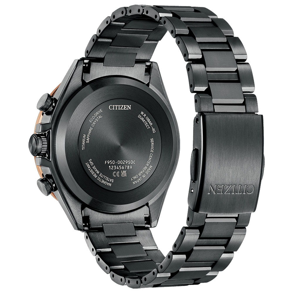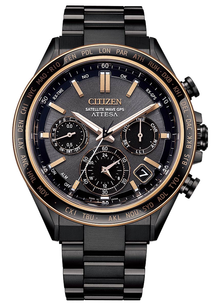 Hodinky jsou zepředu chráněny odolným safírovým sklem s antireflexní vrstvou, které pohlcuje světlo a zajišťuje perfektní čitelnost ciferníku. Sklo chrání černý ciferník s výraznými ručkami a indexy. Ty jsou vyplněny svítící luminiscencí pro snadné odečítání času ve tmě. Mezi čtvrtou a pátou hodinou se nachází datumovka. Na deváté hodině je umístěna pomocná ručička zobrazující den v týdnu a ukazatel nabití akumulátoru. Tento multifunkční GPS hodinky nabízejí funkce jako: alarm, 40 časových pásem (zkratky 27 měst umístěné na rámečku pouzdra), chronograf s přesností 1/20 sekundy, věčný kalendář, ukazatel letního času a indikátor rezervy chodu. O přesný chod se stará GPS satelitní připojení. Značka Citizen se pyšní mimořádnou rychlostí připojení k satelitům – až do 3 sekund.