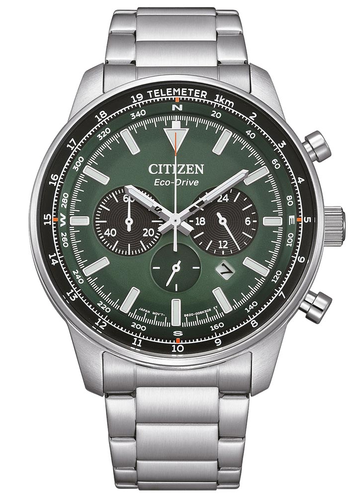Počínaje zeleným ciferníkem hodinky okamžitě upoutají pozornost. Geografické směry natištěné kolem číselníku slouží jako manuální kompas a funkce telemetru zdůrazňuje hodinky jako nástroj nejen pro měření času, ale také nepostradatelný pro nadšence létání. Solární mechanismus Eco-Drive s chronografem a 24hodinovou časovou funkcí umožňuje přesné měření v krátkých okamžicích i delších obdobích. Toto je ideální řešení pro lidi, kteří oceňují stylový design a funkčnost v jednom.