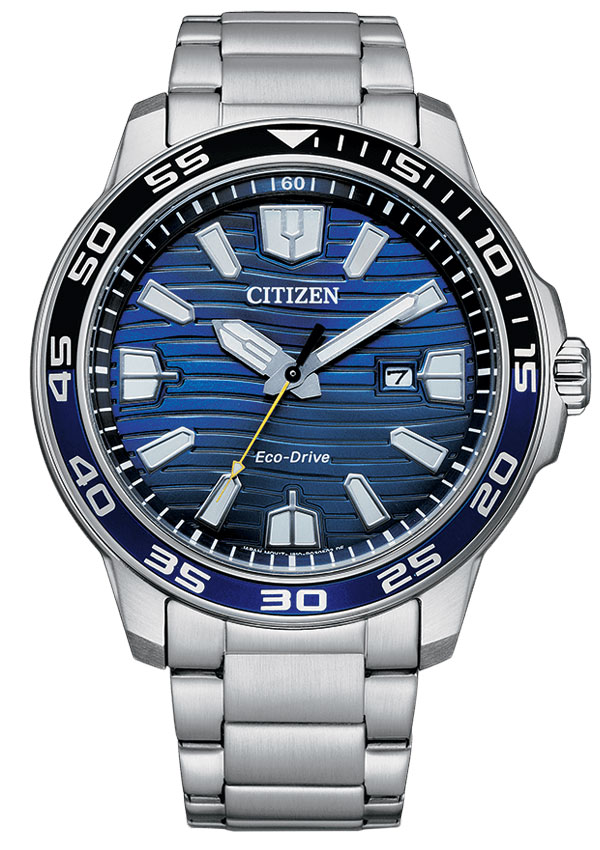 Japonská značka představuje diverské hodinky Citizen Diver AW1525-81L s výkonnými rozměry. Pouzdro z nerezové oceli má průměr 46 mm s výrazným černomodrým diverským prstenem. Silné minerální sklo chrání modrý ciferník se vzorem připomínajícím vlny oceánu. Široké, masivní indexy a ručičky jsou vyplněny luminiscenční látkou, zajišťující čitelnost ve tmě i pod vodou. Šroubovací víko zajišťuje těsnost 10 barů, což stačí na plavání a potápění. Ocelový náramek s odnímatelnými články se hodí na zápěstí s maximálním obvodem 190 mm. Bezpečná spona odnímatelná pomocí knoflíků.