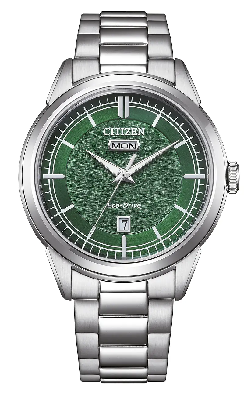Citizen Elegance Classic AW0151-85X je vytříbeným spojením tradičního hodinářství s moderním, ekologickým pohonem. Tento model přitahuje pozornost číselníkem v hlubokém odstínu lahvově zelené, jehož centrální část má unikátní zrnitou strukturu. Tato nejednotná textura dodává ciferníku surový, a zároveň luxusní charakter a tvoří dokonalé pozadí pro vystouplé logo Citizen a leštěné ručičky s ostrým profilem.