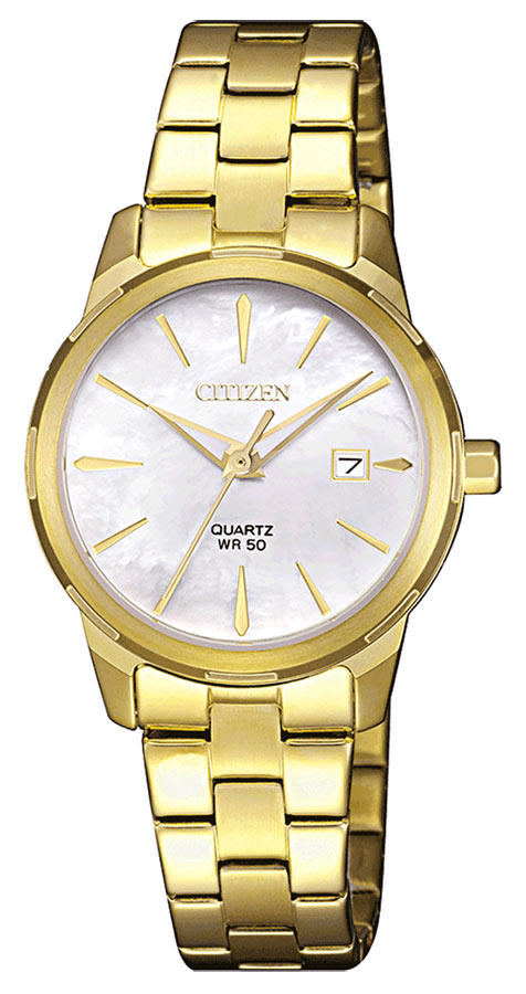 Citizen Elegance EU6072-56D jsou elegantní, pozlacené dámské hodinky o malém průměru ( 28 mm ) od japonské značky CITIZEN. Jeho prestižní barvy vycházejí téměř výhradně z tónů žlutého zlata. Výjimkou je povrch ciferníku, který se třpytí nádhernou a smyslnou perletí. Je to perfektní model pro každodenní i elegantní večerní příležitosti. Unikátní číselník obsahuje 12 aplikovaných ozdobných indexů, pozlacené ručičky, logo a označení Machineku. Kromě časové stupnice a luminiscenční indikace na ciferníku je na ciferníku minimalistické zlatě orámované datumové okénko na 3. hodině.