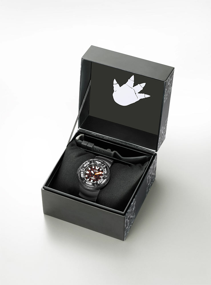 Pevné 48.2 mm šedé ocelové pouzdro v charakteristické podobě Promaster Dive je základem stylu s laserem aplikovaným maskovacím vzorem, který skrývá Godzillu a zároveň připomíná šupinatou kůži šelmy. Atmosférický detail pokračuje také na zadní straně pouzdra, kde je vyražena stopa Godzilly.