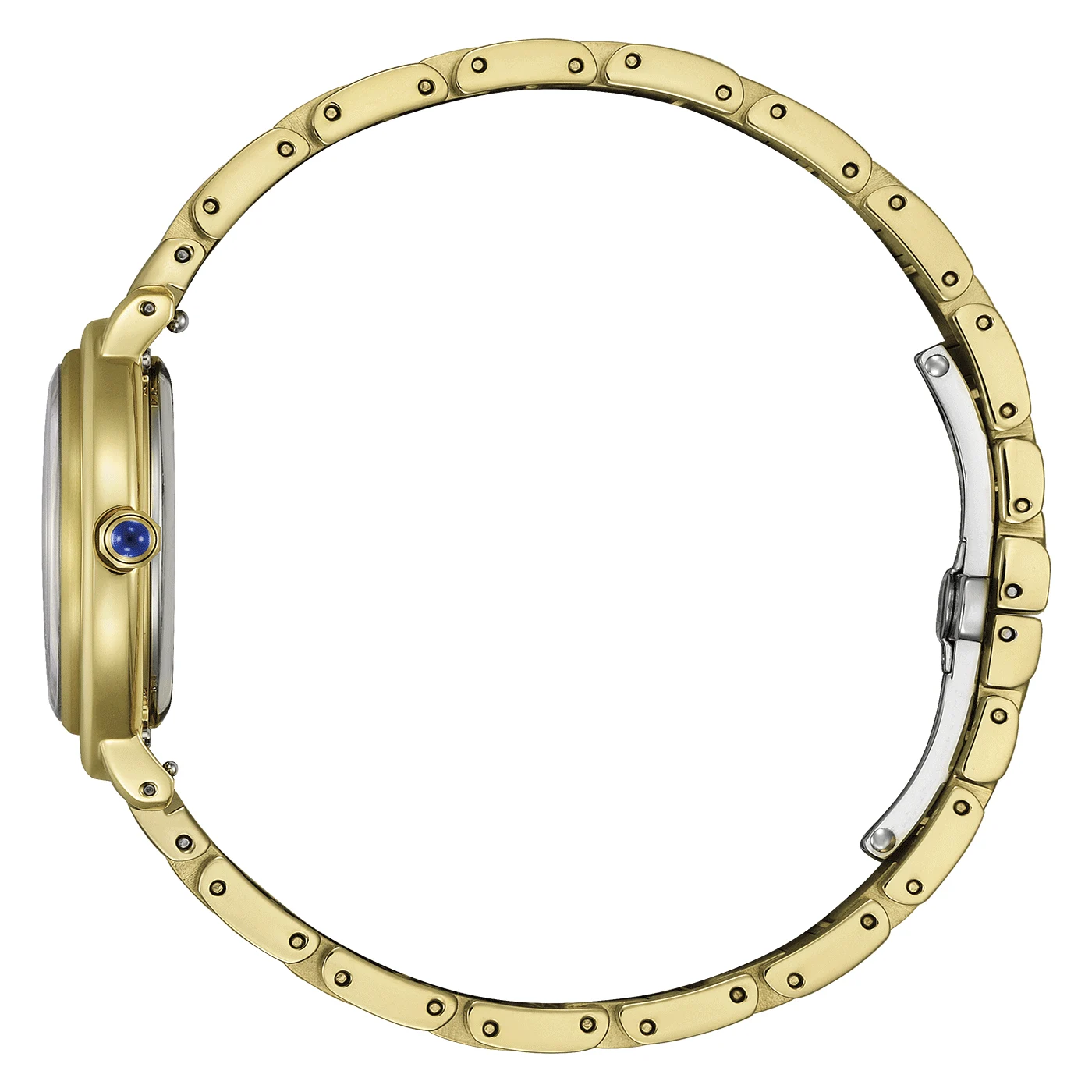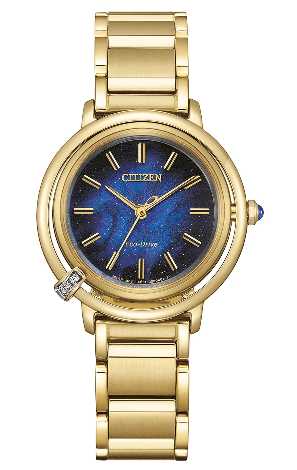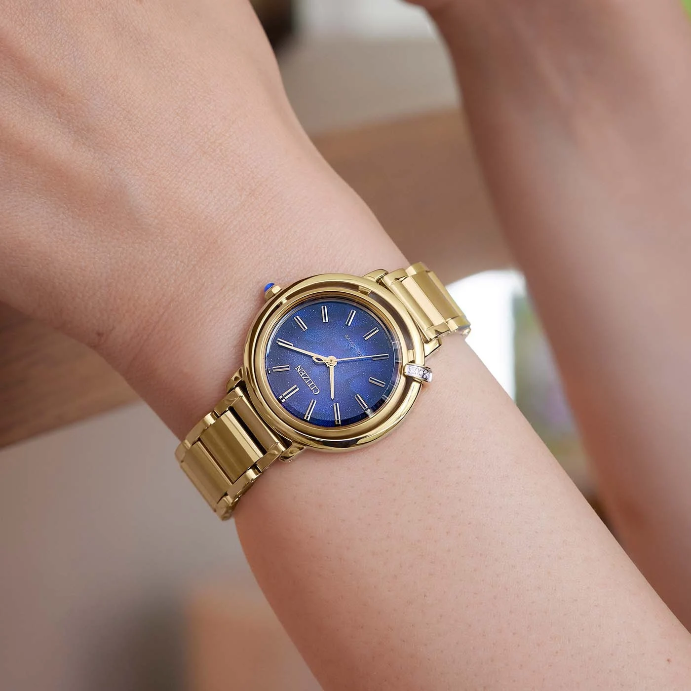Citizen L Arcly EM1099-57L je limitovaná dámská edice, která spojuje jemnou krásu šperku s pokročilou technologií Eco-Drive. Pozlacené pouzdro o průměru 31,20 mm a štíhlém profilu 7,83 mm ukrývá elegantní číselník v hlubokém, tmavě modrém odstínu, zdobený jemným prachem připomínajícím hvězdnou oblohu. Tři třpytivé diamanty dodávají hodinkám výjimečný lesk a činí z tohoto modelu ideální volbu pro večerní události a zvláštní příležitosti.