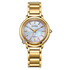Pouzdro i náramek jsou vyrobeny z ušlechtilé oceli se zlatou povrchovou úpravou, která dodává hodinkám luxusní charakter a zajišťuje jejich dlouhou životnost. Spona s dvojitým tlačítkem garantuje bezpečné a pohodlné nošení, zatímco celek působí jako elegantní doplněk dámského šatníku.