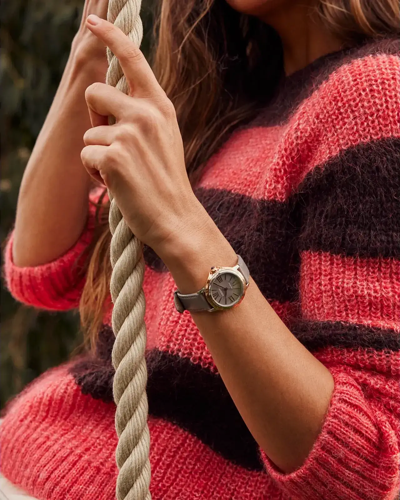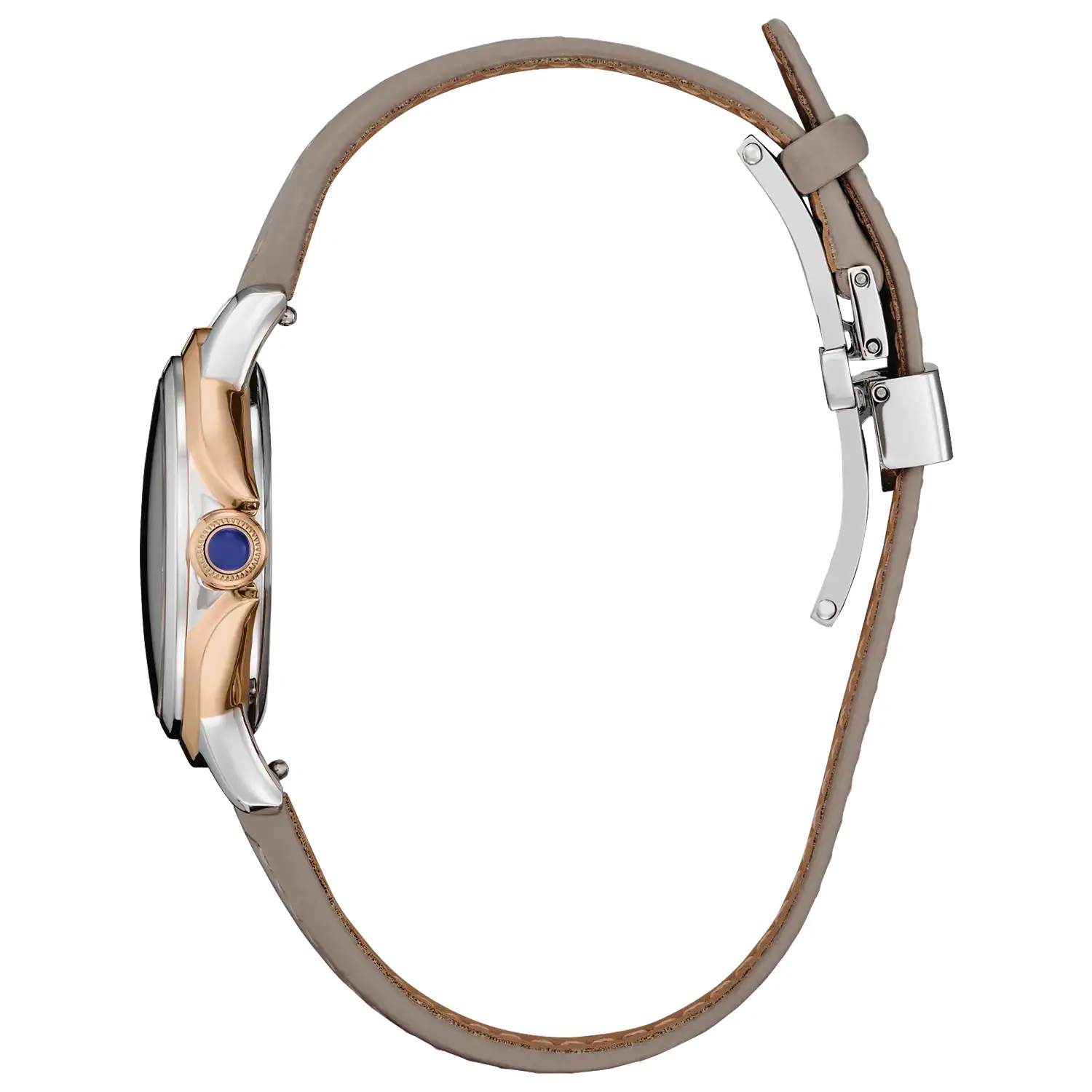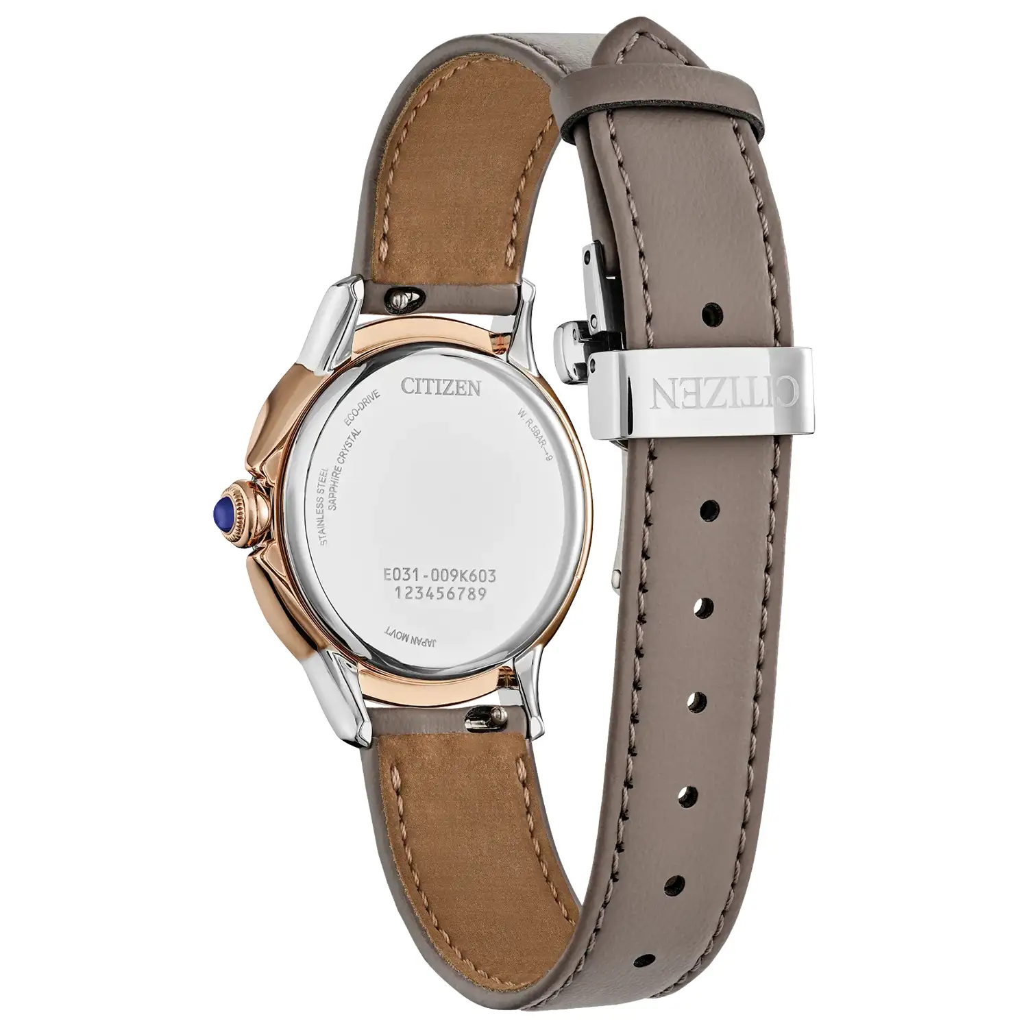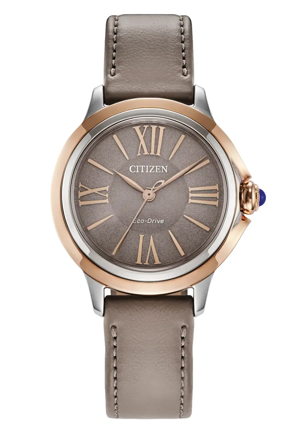 Citizen L Ceci EM1166-01Z jsou jedinečné hodinky, které spojují eleganci s moderností. S pouzdrem z nerezové oceli v odstínech stříbra a růžového zlata (32 mm) a korunkou zdobenou syntetickým safírem působí hodinky mimořádně subtilně a žensky. Taupe ciferník s akcenty z růžového zlata a římskými číslicemi mu dodává nadčasový klasický vzhled, ideální pro různé příležitosti.