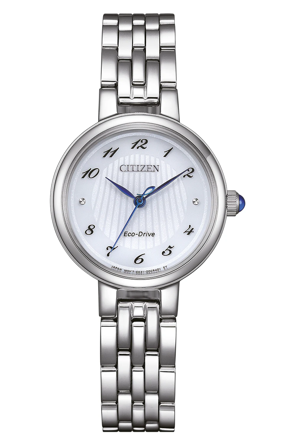 Citizen Lady EM0990-81A jsou dámské hodinky, které jemně spojují klasickou eleganci s moderní technologií Eco-Drive. Štíhlé pouzdro o průměru 27,7 mm a výšce pouhých 7,73 mm je vyrobeno z nerezové oceli ve stříbrném odstínu, což dodává hodinkám univerzální a nadčasový charakter. Bílý číselník zdobený arabskými číslicemi a jemnými svislými pruhy působí přehledně a ladně, zatímco modré ručky dodávají celku sofistikovaný kontrast.