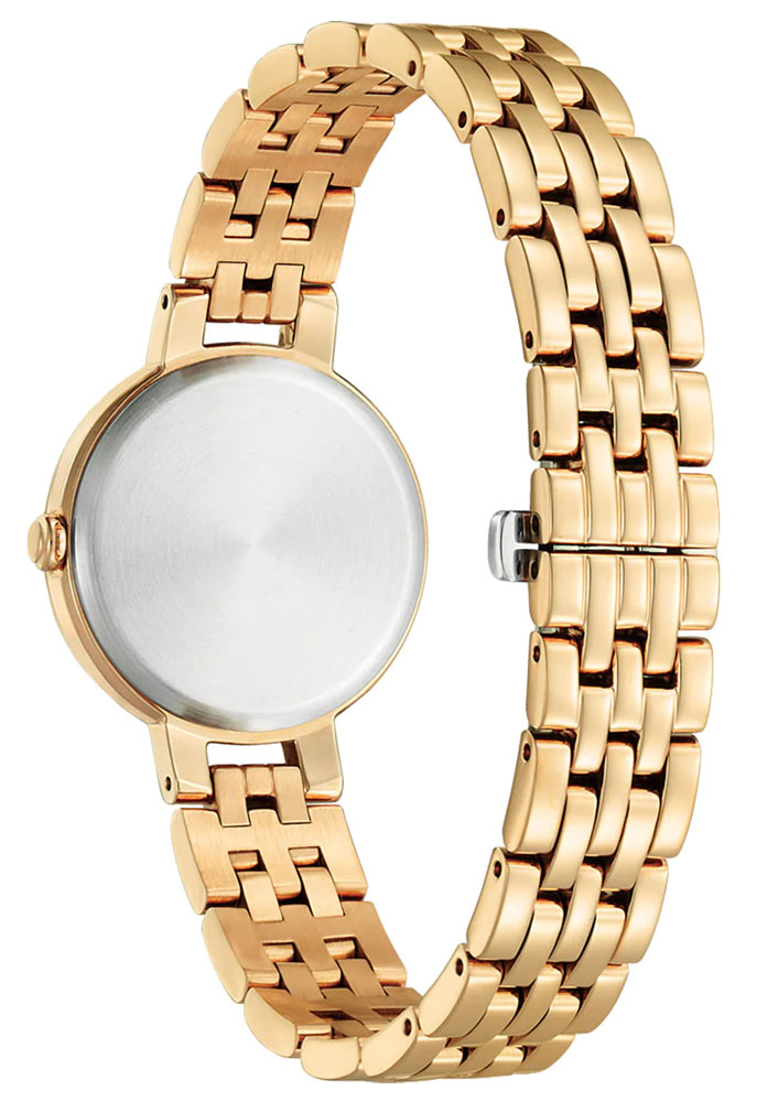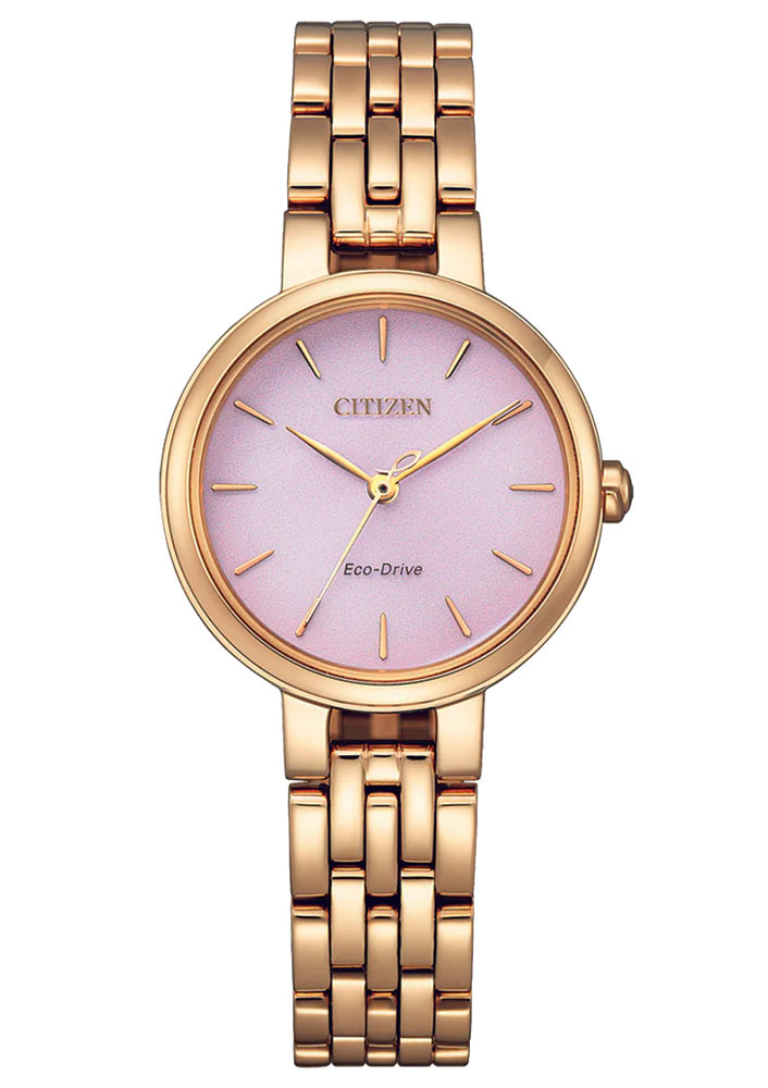 Klasické dámské hodinky Citizen Lady EM0993-82X s pouzdrem o průměru 28 mm a náramkem z nerezové oceli s motýlkovou sponou. Celé je to pozlaceno růžovým zlatem. Ohromující růžový ciferník se štíhlými zlatými indexy a ručičkami. Mezi další vlastnosti patří safírové sklo odolné proti poškrábání, vodotěsnost 50 ma technologie Eco-Drive . Hodinky jsou napájeny z libovolného zdroje světla, odpadá tak nutnost výměny baterie.