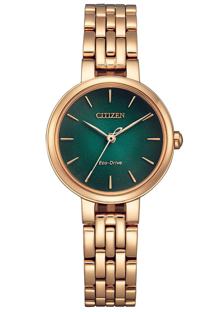 Klasické dámské hodinky Citizen Lady EM0993-82Z s průměrem pouzdra 28mm a náramkem z nerezové oceli s motýlkovým zapínáním. Celé je to pozlaceno růžovým zlatem. Ohromující zelený ciferník s tenkými indexy a zlatými ručičkami. Mezi další vlastnosti patří safírové sklo odolné proti poškrábání, vodotěsnost 50 ma technologie Eco-Drive . Hodinky jsou napájeny z libovolného zdroje světla, odpadá tak nutnost výměny baterie.