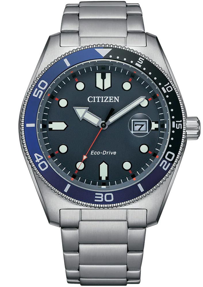 Pánské hodinky Citizen Marine AW1761-89L vyrobené z nerezové oceli s výrazným, diverským vzhledem. Plavecké hodinky s třídou vodotěsnosti 10 barů, šroubovací zadní částí pouzdra a ocelovým náramkem, který se příjemně nosí. Modrý, čirý ciferník má velké indexy a ručičky pokryté nejkvalitnější luminiscenční hmotou, která velmi jasně a dlouho svítí. Stejný materiál se nachází na špičce červeně zakončené vteřinové ručky. Černomodrý diverský prsten má vyrytou diverskou stupnici. Čitelnost pod vodou doplní lupa na datumovce.
