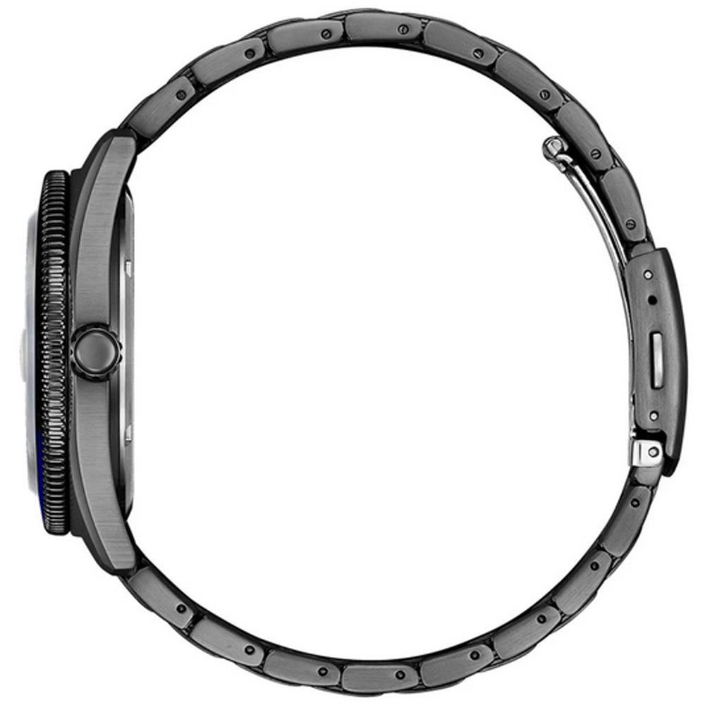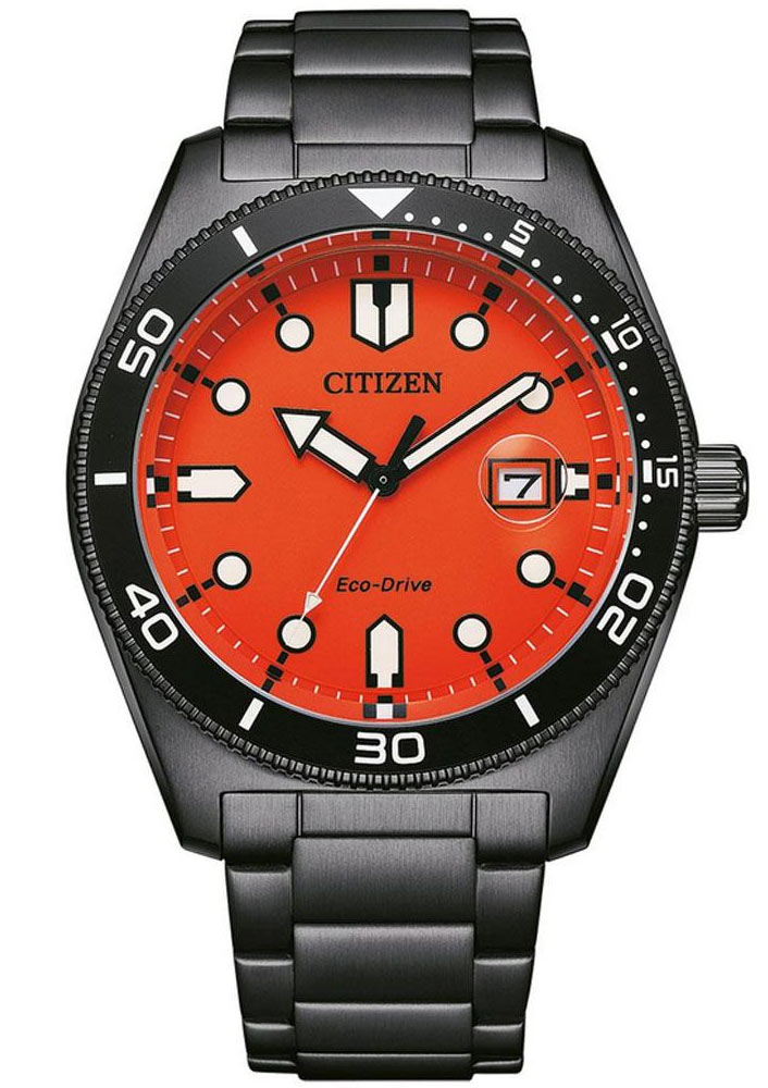 Pánské hodinky Citizen Marine AW1765-88X vyrobené z nerezové oceli s výrazným, diverským vzhledem. Černé pouzdro a náramek s PVD povlakem dokonale ladí s ciferníkem. Plavecké hodinky s třídou vodotěsnosti 10 barů, šroubovací zadní částí pouzdra a ocelovým náramkem, který se příjemně nosí. Oranžový, čirý ciferník má velké indexy a ručky pokryté nejkvalitnější luminiscenční hmotou, která se velmi jasně a dlouho leskne. Stejný materiál se nachází na špičce bílé vteřinové ručky. Diverský prsten také v černé barvě má na sobě vyrytou diverskou stupnici. Čitelnost pod vodou doplní lupa na datumovce.