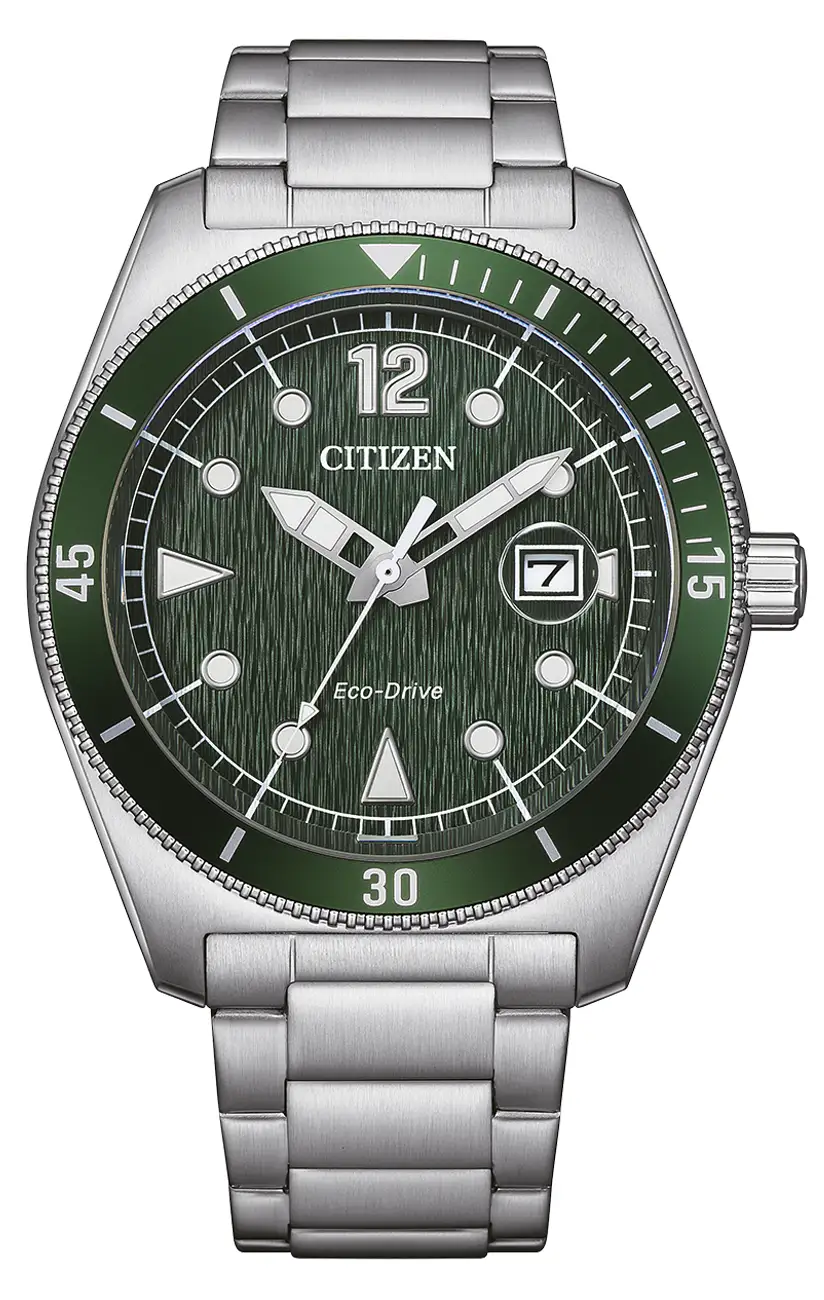 Citizen Marine Sports AW1880-55X jsou hodinky navržené pro nadšence aktivního životního stylu, které spojují potápěčskou stylistiku s moderní solární technologií. Nejintrigujícím prvkem tohoto modelu je číselník v hlubokém, mořském odstínu zelené, vybavený unikátní vertikální strukturou připomínající surovou texturu kůry stromu nebo ztuhlé vlny. Tento neobvyklý vzor dodává číselníku hloubku a způsobuje, že hodinky působí odlišně v závislosti na úhlu dopadu světla.