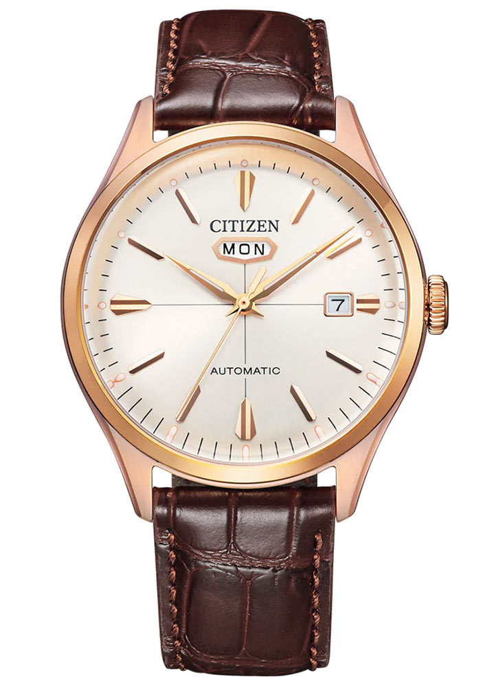Aktuální model Citizen Mechanical NH8393-05AC s krásně zpracovaným ocelovým pouzdrem o průměru 40,2 mm v pozlaceném provedení. Ukrývá moderní ciferník stříbrné barvy s pozlacenými prvky. Jeho barevnost je zdůrazněna sunburstem, aplikovanými indexy přímo ze 70. let a dvěma centrálně se protínajícími liniemi. Japonský výrobce unikátním způsobem umístil datumovku s názvem dne v týdnu na 12. hodinu, ukazatel dne v měsíci pak na 3. Celé je chráněno vypouklým minerálním sklem. Vzhled a styl přímo odkazují na hodinky z doby před lety.
