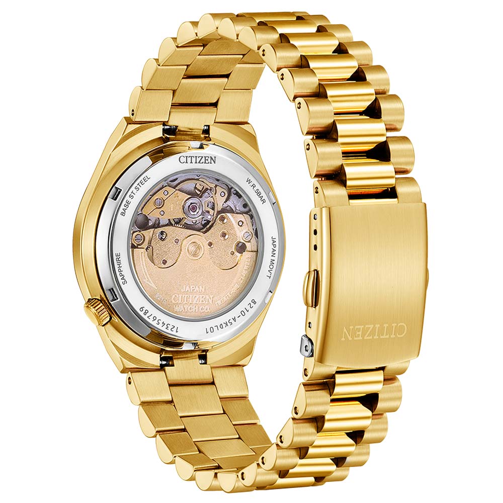 Japonské hodinky Citizen Tsuyosa Mechanical NJ0153-82X jsou klasické pánské hodinky se zlaceným pouzdrem o kompaktní velikosti 40 mm. Pouzdro má perfektně padnoucí, pozlacený náramek z oceli, který pohodlně sedí na každém mužském zápěstí. Náramek je vybaven bezpečným a snadno použitelným motýlkovým zapínáním na dvě tlačítka. Zadní strana hodinek Citizen je ocelový, šroubovací kryt s průhledným okénkem, které umožňuje obdivovat práci japonského mechanismu Miyota Automatic. Tento model nabízí ultramoderní styl a rafinovaný design, který vynikne na zápěstí.
