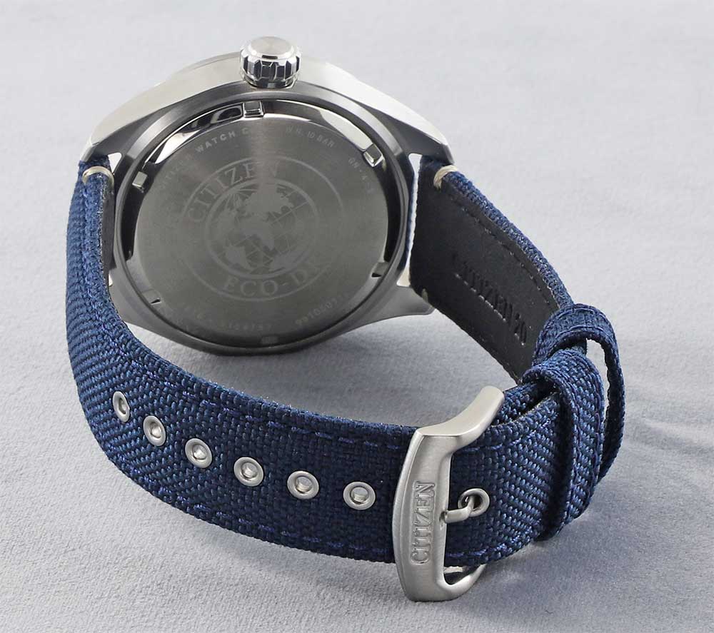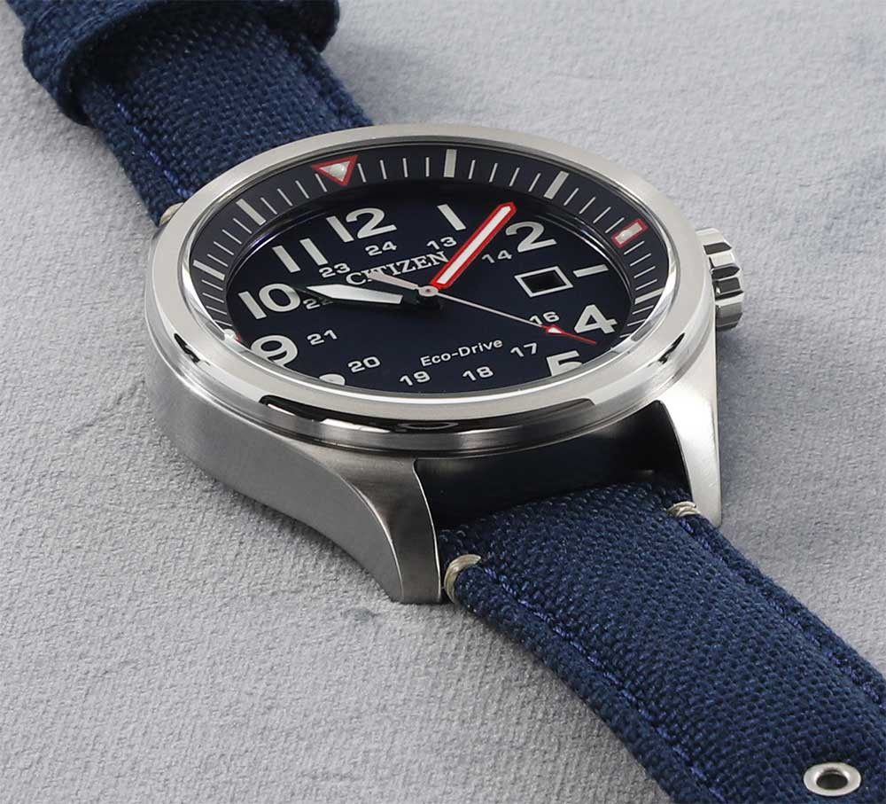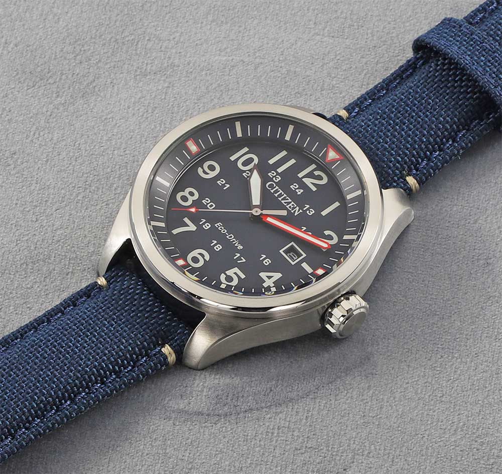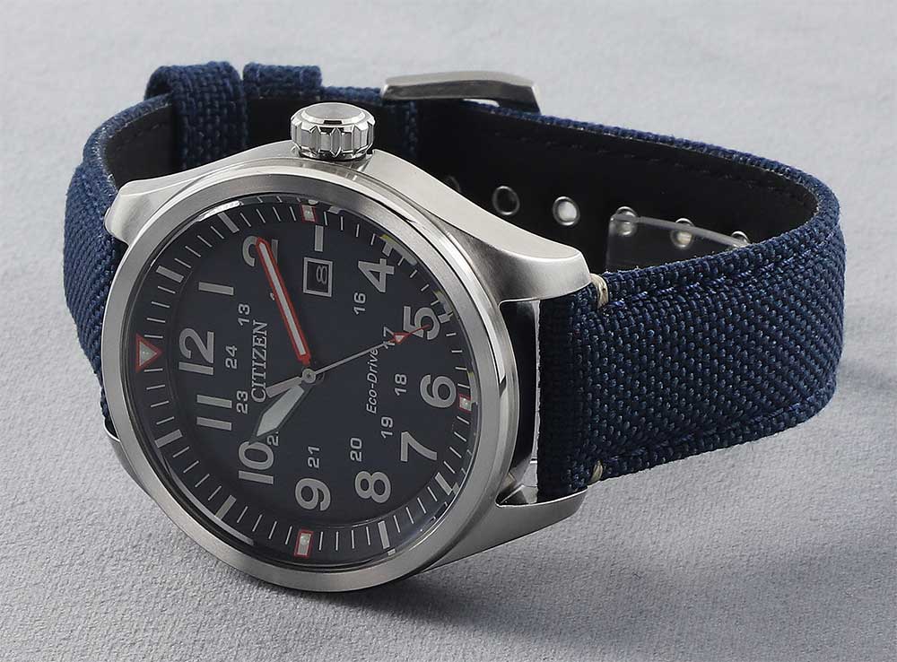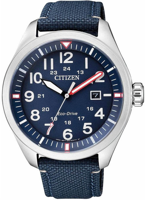 Pánské hodinky ve vojenském, vojenském stylu. Modrý ciferník s přehlednými arabskými indexy a velké ručičky umožňují snadné odečítání času za všech podmínek. Třída těsnosti WR100/100m vám umožňuje volně plavat. Modrý kožený řemínek s bílými doplňky. Tento model má navíc mechanismus Eco-Drive napájený sluncem, ciferník funguje jako solární baterie, která přeměňuje světelnou energii na energii, která pohání hodinky a ukládá je do speciální baterie. Životnost takové baterie je cca 7-10 let.