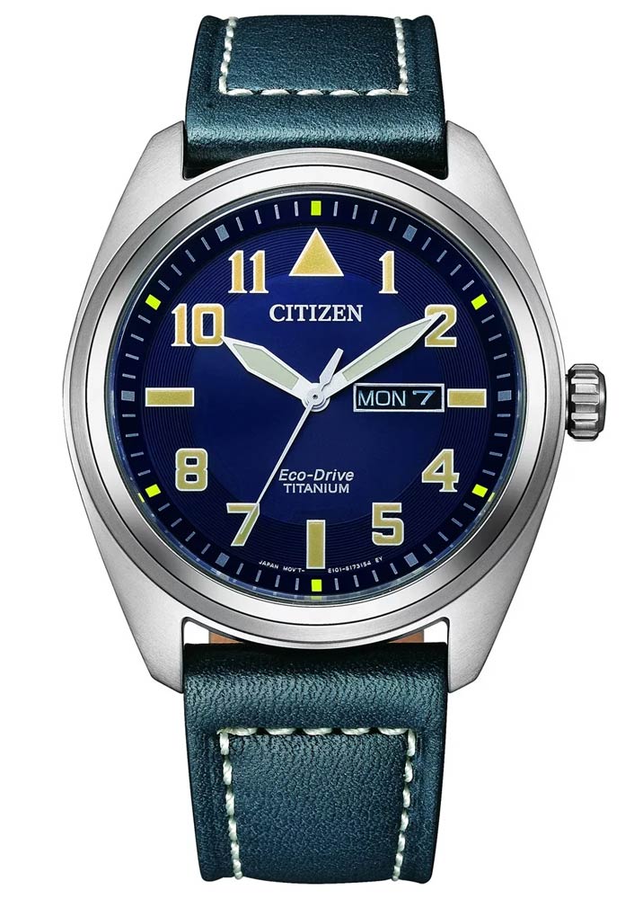 Vojenské hodinky Citizen Military BM8560-45LC v titanovém provedení. Extrémně lehký, příjemný na nošení a hypoalergenní materiál Super Titanium použitý v těchto hodinkách poskytuje bezkonkurenční pohodlí při nošení. Surový, matný povrch pouzdra a modrý kožený řemínek s bílým prošíváním dodávají outdoorový charakter. Modrý ciferník se žlutými sportovními akcenty, arabskými indexy a ručičkami vyplněnými luminiscenční látkou Old Radium. Celý je pokryt safírovým sklíčkem odolným proti poškrábání. Citizen Military je vybaven mechanismem Eco-Drive napájeným z libovolného zdroje světla. Toto řešení je velmi užitečné. Není potřeba vyměňovat baterii každé 2 roky, baterie v mechanismu uchovává energii potřebnou k provozu hodinek. Další užitečnou funkcí je datumovka rozšířená o název dne v týdnu.