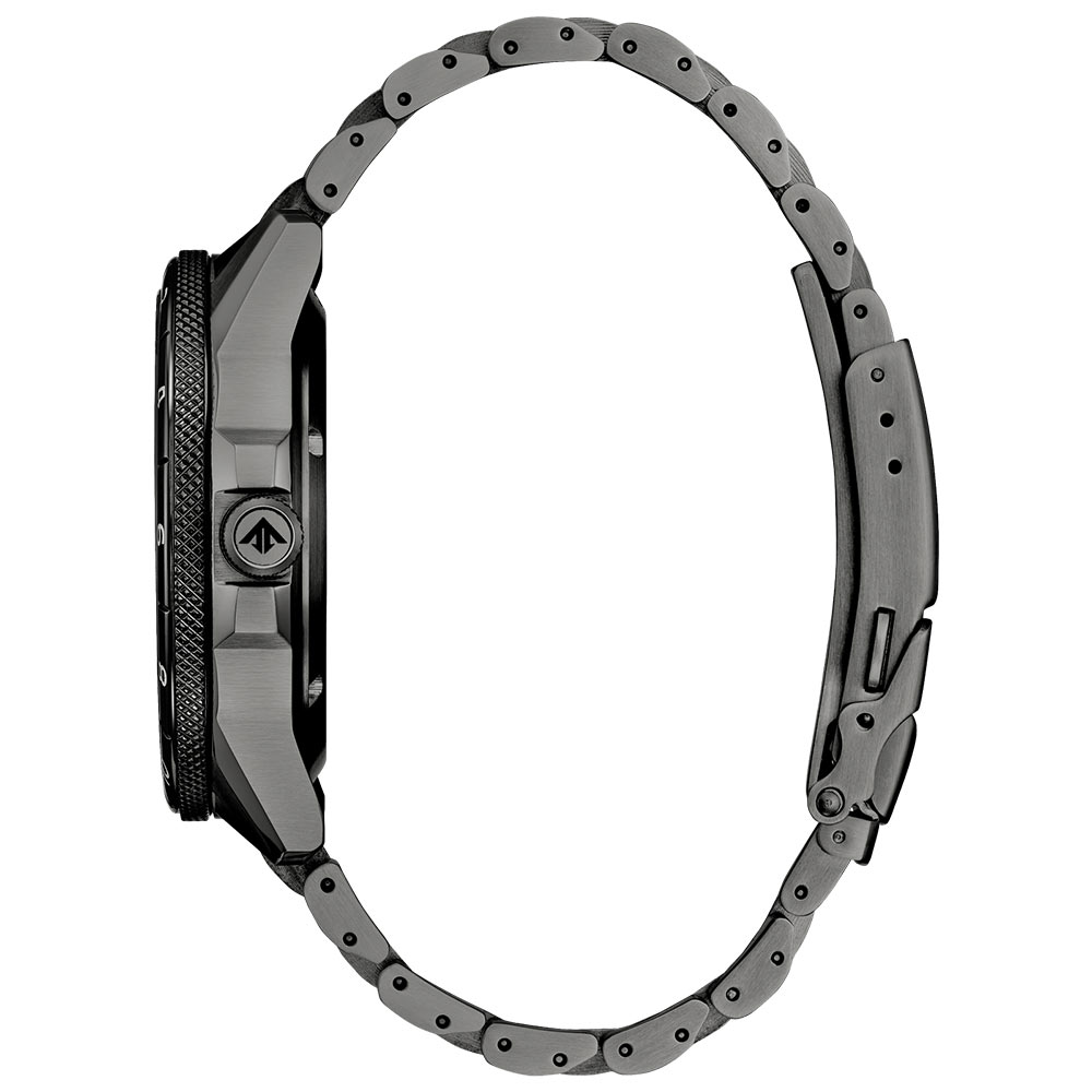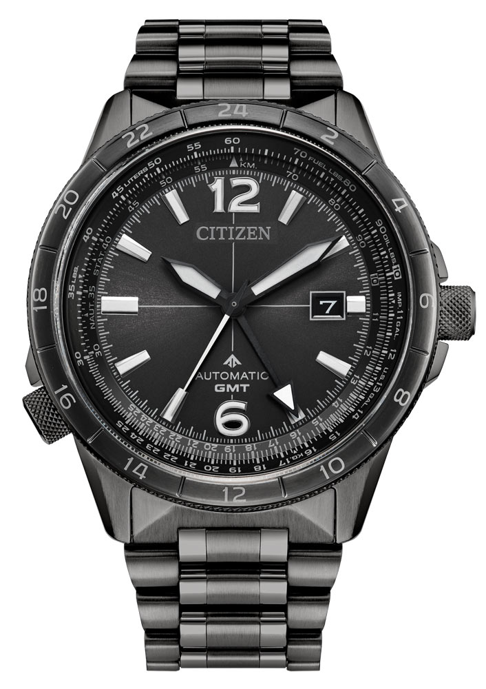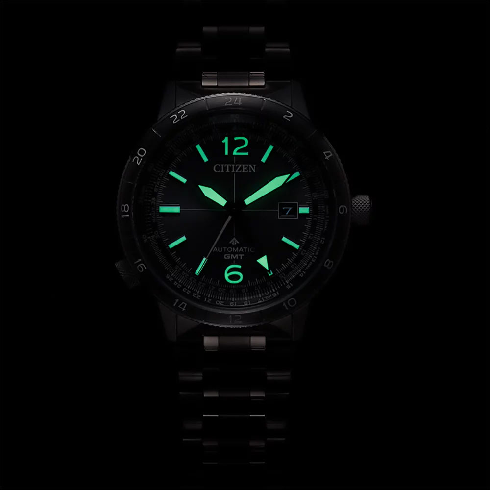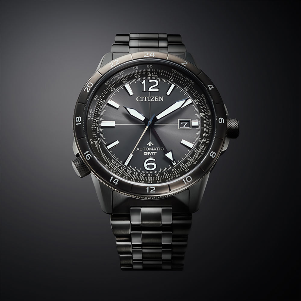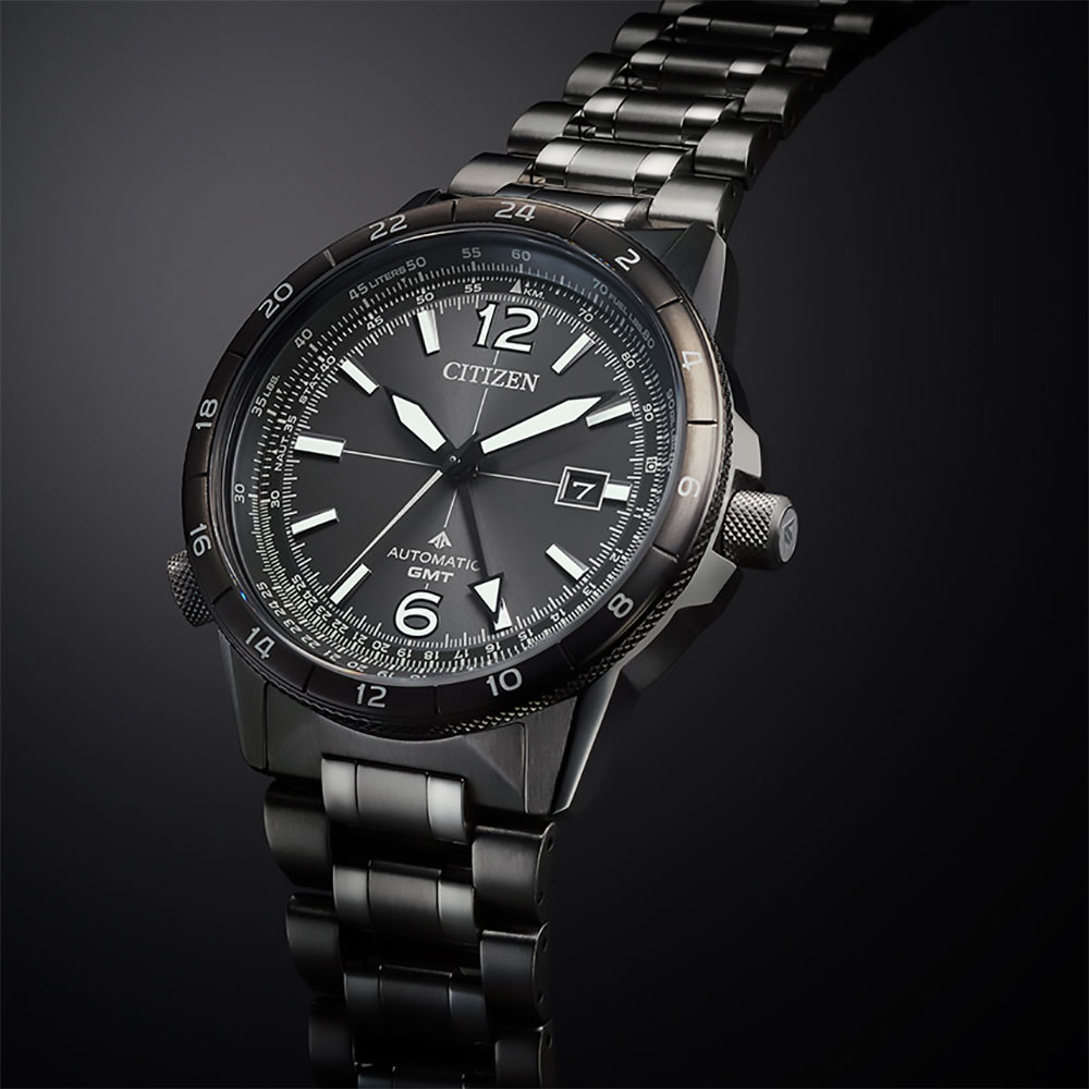 Pouzdro a náramek jsou vyrobeny z nerezové oceli s tmavě šedou iontovou povrchovou úpravou. Výrazná luneta s 24hodinovou stupnicí slouží k označení času GMT a přidává další letecký charakter. Na spodní straně hodinek je šroubovací kryt s vyrytým obrázkem pilota a na vnější straně safírové sklíčko s antireflexní vrstvou. Je odolný proti poškrábání a dodává ciferníku průhlednost. Srdcem modelu Promaster Air GMT je automatický strojek Citizen Caliber 9054 zaručující spolehlivost, 50hodinovou rezervu chodu a magnetickou odolnost až 16 000 A/M.