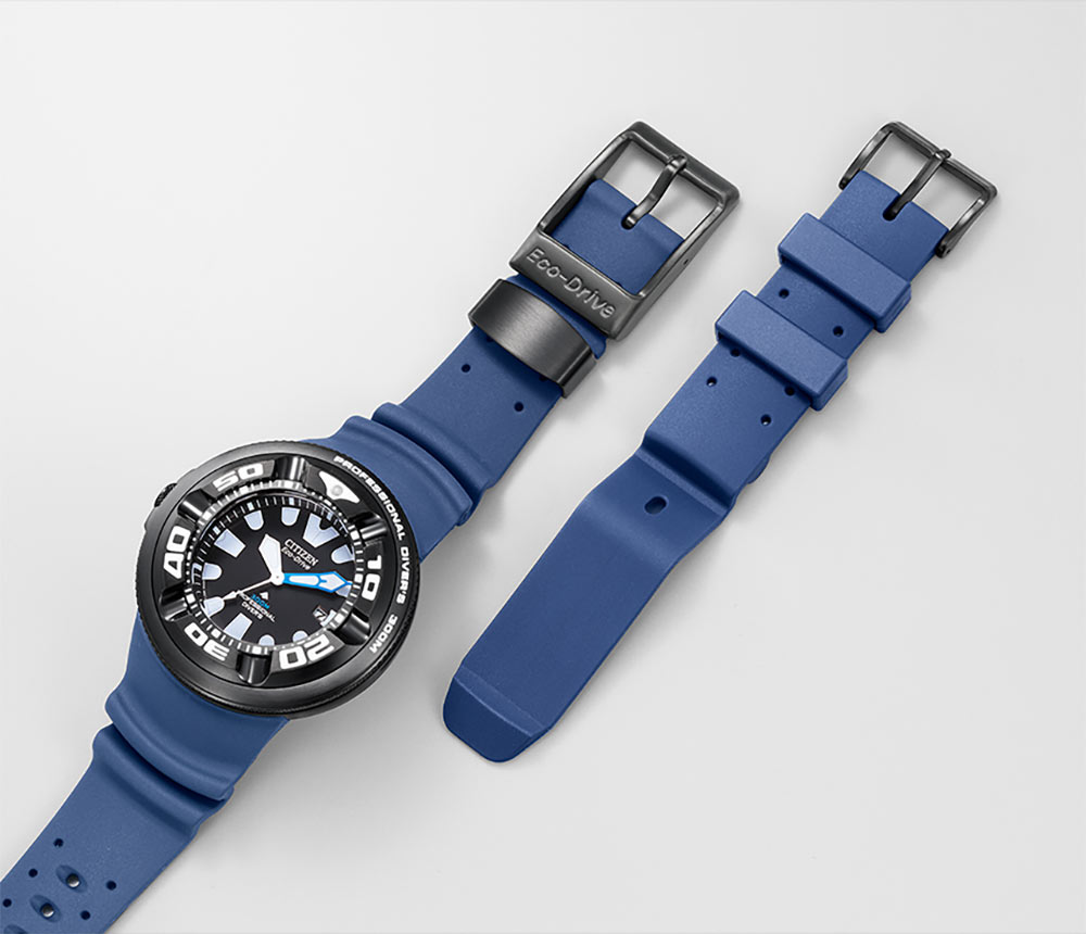 Velké pouzdro, průměr 48,20 mm, z černé nerezové oceli. Utěsněno na 300 metrů, což vám umožňuje potápět se bez obav ze zaplavení. Dalším prvkem je u tohoto modelu šroubovací korunka umístěná na levé straně. Stejně jako šroubovací víko na zadní straně pouzdra jsou důležitými prvky těsnosti celé konstrukce. Užitečným doplňkem na pouzdru hodinek je jednosměrná diverská luneta. Otočná luneta s minutovou stupnicí vám pomůže sledovat ubíhající čas například při ponoření. Má svítící fix na 12. hodině. Hodinky jsou spárovány s modrým gumovým páskem. Je pružný a voděodolný, což zvýší komfort jeho používání a čištění.