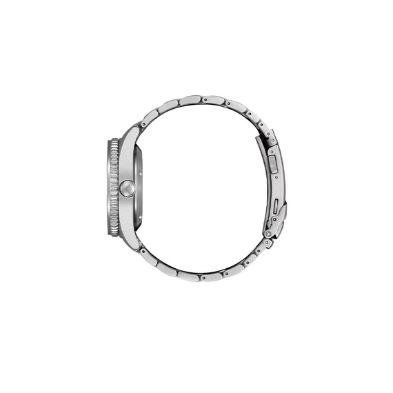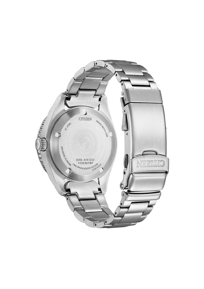 Japonské pánské hodinky Citizen Promaster Challenge Diver NY012958LE se skládají z kulatého ocelového pouzdra o velikosti 41 mm. Ocel je nejoblíbenější materiál používaný k výrobě pouzdra hodinek. Kartáčované pouzdro je odolné vůči vodě až do hloubky cca 200 metrů. To vám umožní potápět se bez obav z poškození mechanismu tohoto sportovního modelu. Na pravé straně hodinek je tradičně šroubovací korunka u tří hodin. Na zadní straně hodinek je šroubovací ocelový kryt, který spolu s korunkou výrazně posiluje těsnost celé konstrukce. Na přední stranu této časomíry umístil výrobce otočnou lunetu. Na lunetě je minutová stupnice s výrazným bodem na dvanácté hodině. Pomůže vám sledovat plynutí času například při fyzické aktivitě. Stojí za zmínku, že bod dvanáct má značku, která svítí ve tmě. Hodinky Citizen Promaster Challenge Diver jsou spárovány s ocelovým náramkem. Náramek lze zapnout na zápěstí díky bezpečné motýlkové sponě se dvěma knoflíky a bezpečnostní klopou.