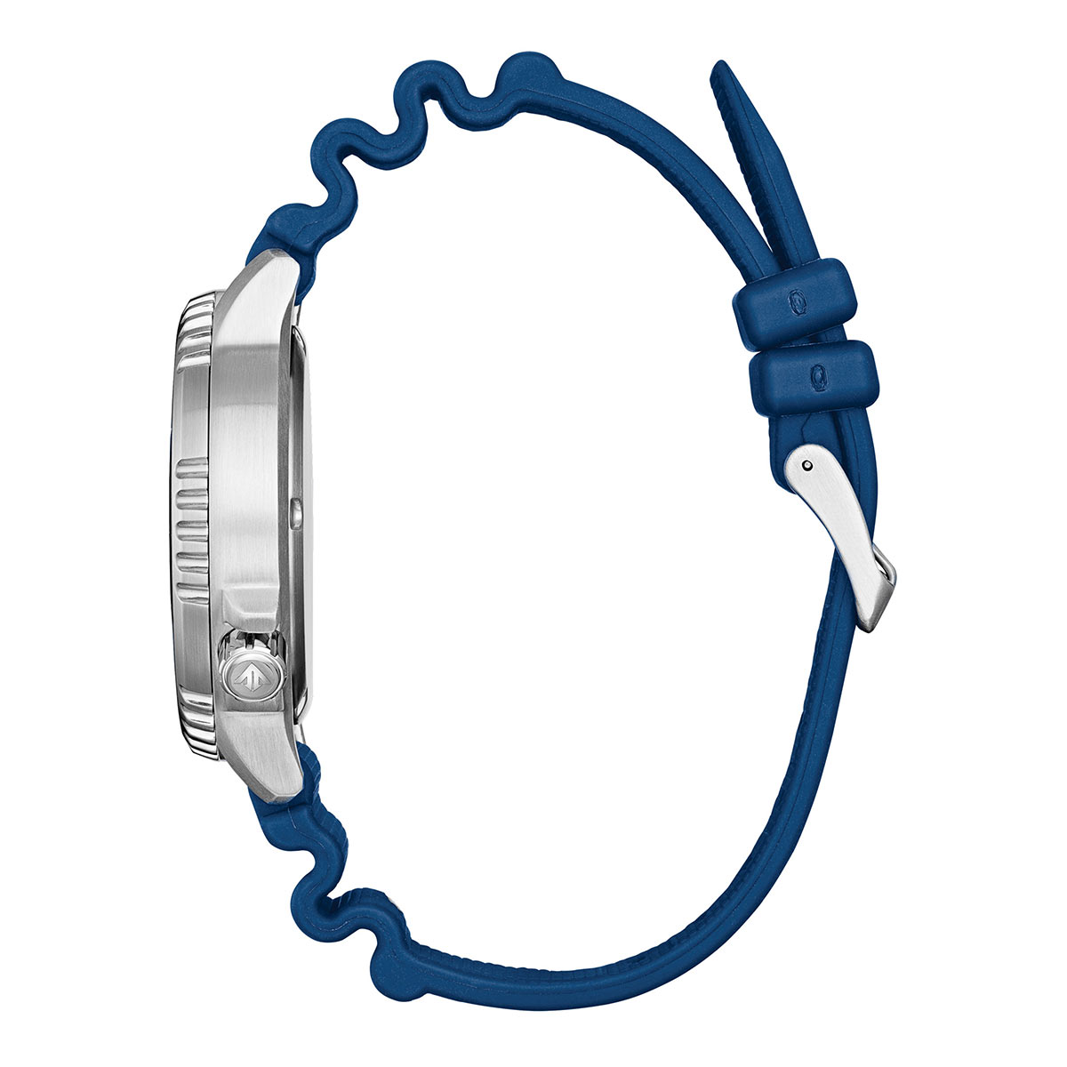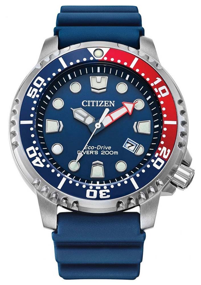 Profesionální diverské hodinky Citizen BN0168-06L z kolekce hodinek PROMASTER MARINE . Hodinky jsou vyrobeny v souladu s pokyny ISO 6425 pro diverské hodinky a zahrnují řadu řešení užitečných pod vodou. Speciální tvar pouzdra z nerezové oceli 44 mm, jednosměrně otočná dvoubarevná diverská luneta se speciálními výřezy, které usnadňují otáčení v rukavicích. Šroubovací hřbet pouzdra a korunka umístěné na čtyřech hodinách, nedotýká se tak zápěstí a nehrozí jeho odšroubování při plavbě pod vodou. Gumový řemínek se speciálním tvarem zajišťuje volný průtok vody přes zápěstí a nepřekáží při potápění. Velmi silná vrstva luminiscenční látky na rukou a indexech zajišťuje viditelnost ve tmě a pod vodou. Spolehlivý solární mechanismus Eco-Drive .