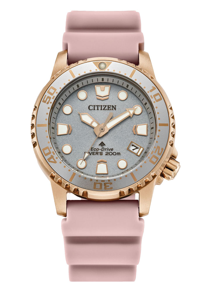 Profesionální diverské hodinky Citizen EO2023-00A z kolekce hodinek PROMASTER v kompaktním dámském a pánském pouzdře velikosti 36,50 mm . Hodinky jsou vyrobeny v souladu s pokyny ISO 6425 pro diverské hodinky a zahrnují řadu řešení užitečných pod vodou. Například: speciální tvar pouzdra z nerezové oceli, nebo jednosměrně otočná luneta se speciálními výřezy, které usnadňují její otáčení například v rukavicích. Šroubovací záda pouzdra a korunka umístěná na čtyřech hodinách, díky čemuž se nedotýká zápěstí a nehrozí jeho odšroubování při plavbě pod vodou.