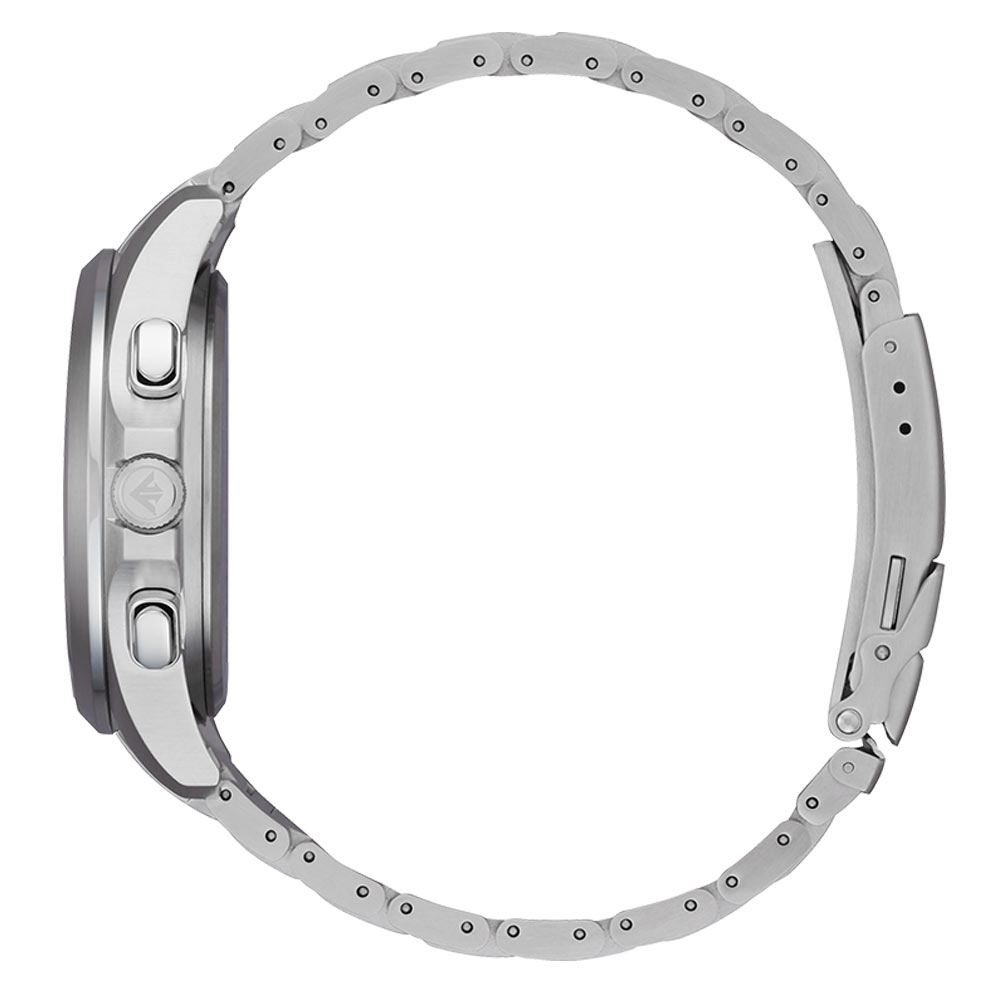 Sportovní hodinky z kolekce Promaster v tlumenějším stylu. Japonský výrobce si už zvykl, že hodinky z této rodiny se vyznačují osobitým a barevným designem. Citizen Promaster Land Racer CB5920-86E je vyroben z nerezové oceli, která dodává o něco klidnější sportovní styl. Pouzdro o průměru 42 mm se safírovým sklíčkem odolným proti poškrábání ukrývá krásný černý ciferník. Ostré bílé indexy a ručičky obsahují látku zářící ve tmě. Součástí silného náramku je motýlková spona s přídavným zámkem na ochranu před nechtěným rozepnutím zámku. To je užitečná vlastnost zejména při potápění, které umožňuje vysoká třída vodotěsnosti 20 bar 200 m.
