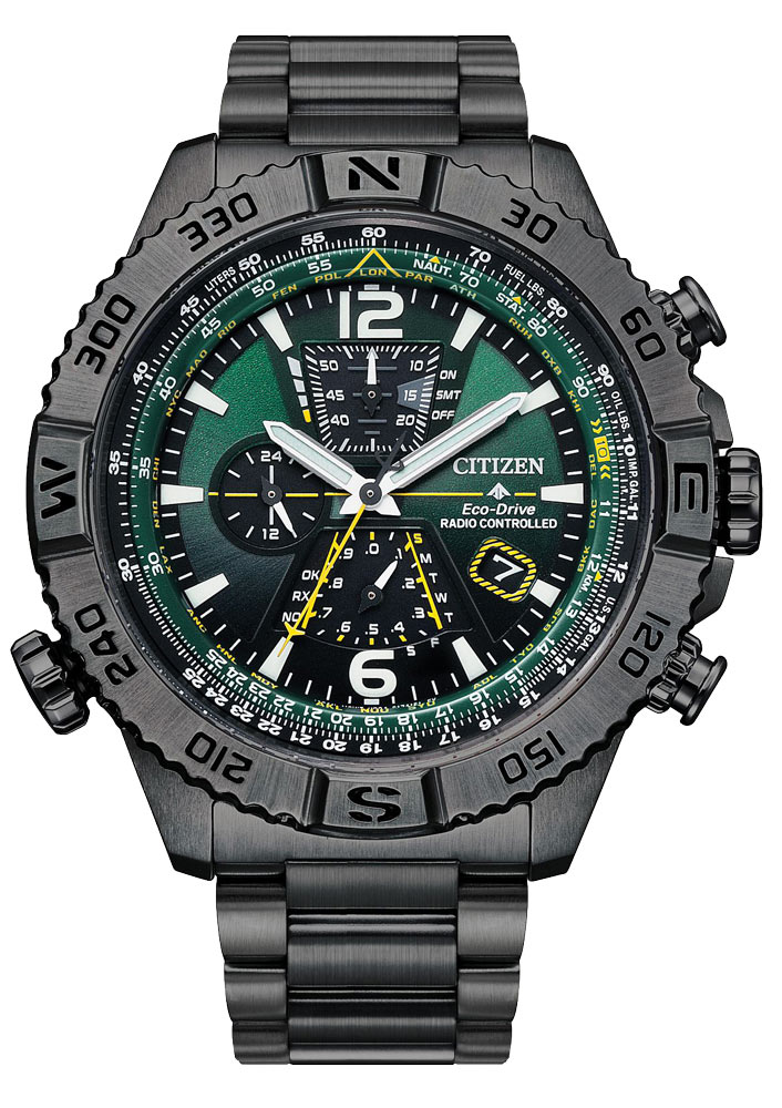 Citizen Radio Controlled přichází s funkcí 26 časových pásem . Na zelený ciferník Citizen umístil názvy měst (zkratky) z různých časových pásem. Otočením prostřední korunky srovnáme nejdelší ručičku s městem, které nás zajímá, a korunku zatlačíme dovnitř. Hodinky samy nastaví přesný čas, který je aktuálně v daném městě. Toto řešení je velmi pohodlné a užitečné pro lidi, kteří hodně cestují. Mezi další funkce patří chronograf, 24hodinový ukazatel času, palivoměr letadla (nastavitelný korunkou na druhé straně pouzdra), indikátor nabití baterie a manuální kompas. Otočný kroužek pouzdra se stupni a geografickými směry.
