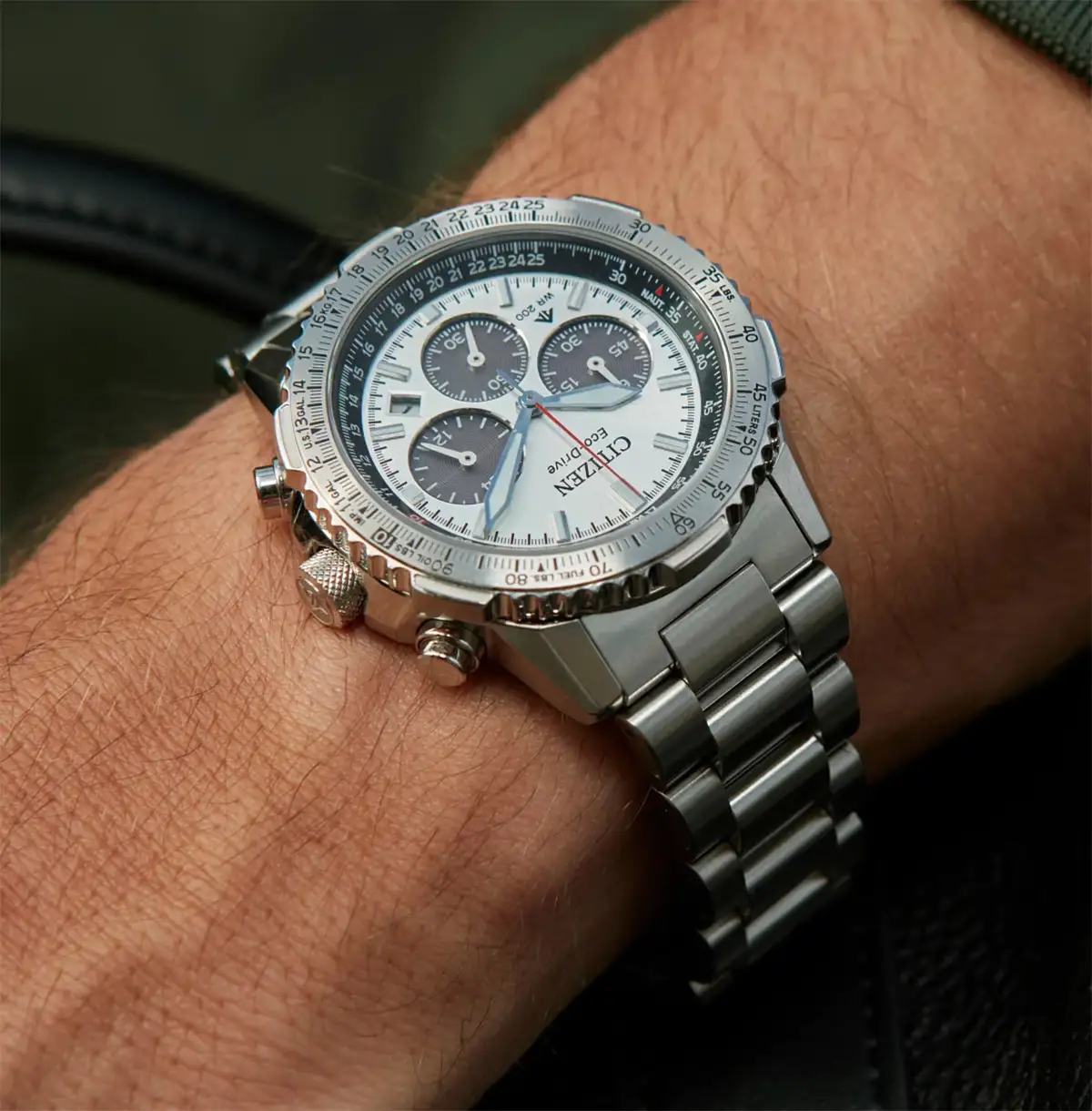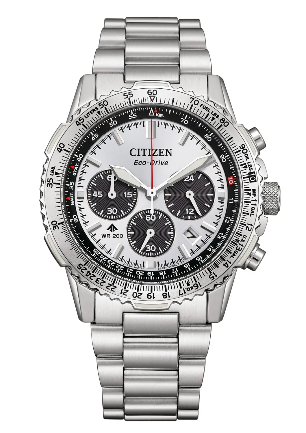 Promaster Air Navihawk CA4660-61A jsou hodinky, které harmonicky spojují leteckou přesnost s jedinečným stylem. Sportovní pouzdro o průměru 40 mm a pevný náramek z odolné nerezové oceli vytvářejí strukturu, která zaujme ostrými detaily a rafinovaným povrchem. Stříbrný číselník s kontrastními subčíselníky chronografu a 24hodinovým zobrazením času, stejně jako logaritmická stupnice, zajišťují vynikající čitelnost a všestrannost za všech podmínek.
