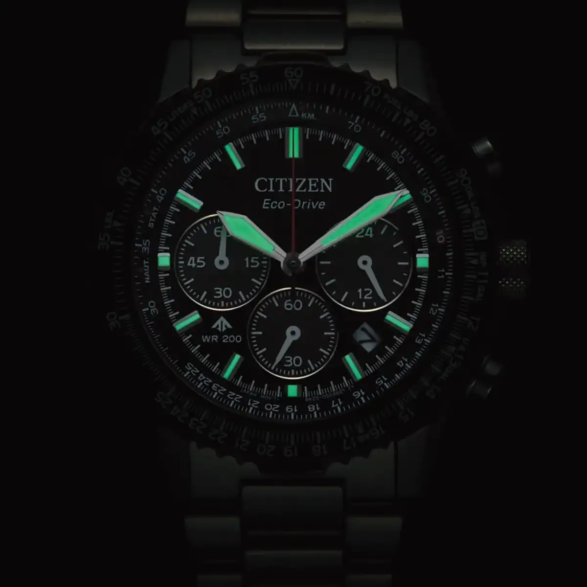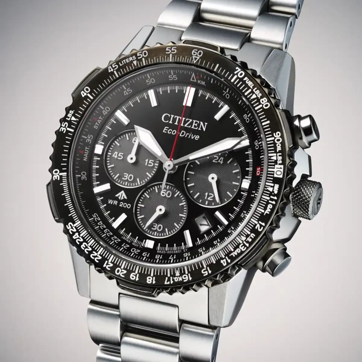 Tento model se vyznačuje hlubokým černým ciferníkem, který v kombinaci s tmavým logaritmickým prstencem dodává celku surový a rozhodný charakter. Ocelové pouzdro o průměru 40 mm ukrývá pokročilý mechanismus s technologií Eco-Drive, která přeměňuje jakýkoli zdroj světla na energii a eliminuje potřebu výměny baterie. Na ciferníku jsou rozmístěny přehledné subciferníky chronografu a praktické zobrazení času ve 24hodinovém formátu, což v kombinaci s datem tvoří kompletní nástroj pro náročné. Safírové sklíčko s antireflexní úpravou chrání vnitřek před poškrábáním a zajišťuje bezvadnou čitelnost z každého úhlu.