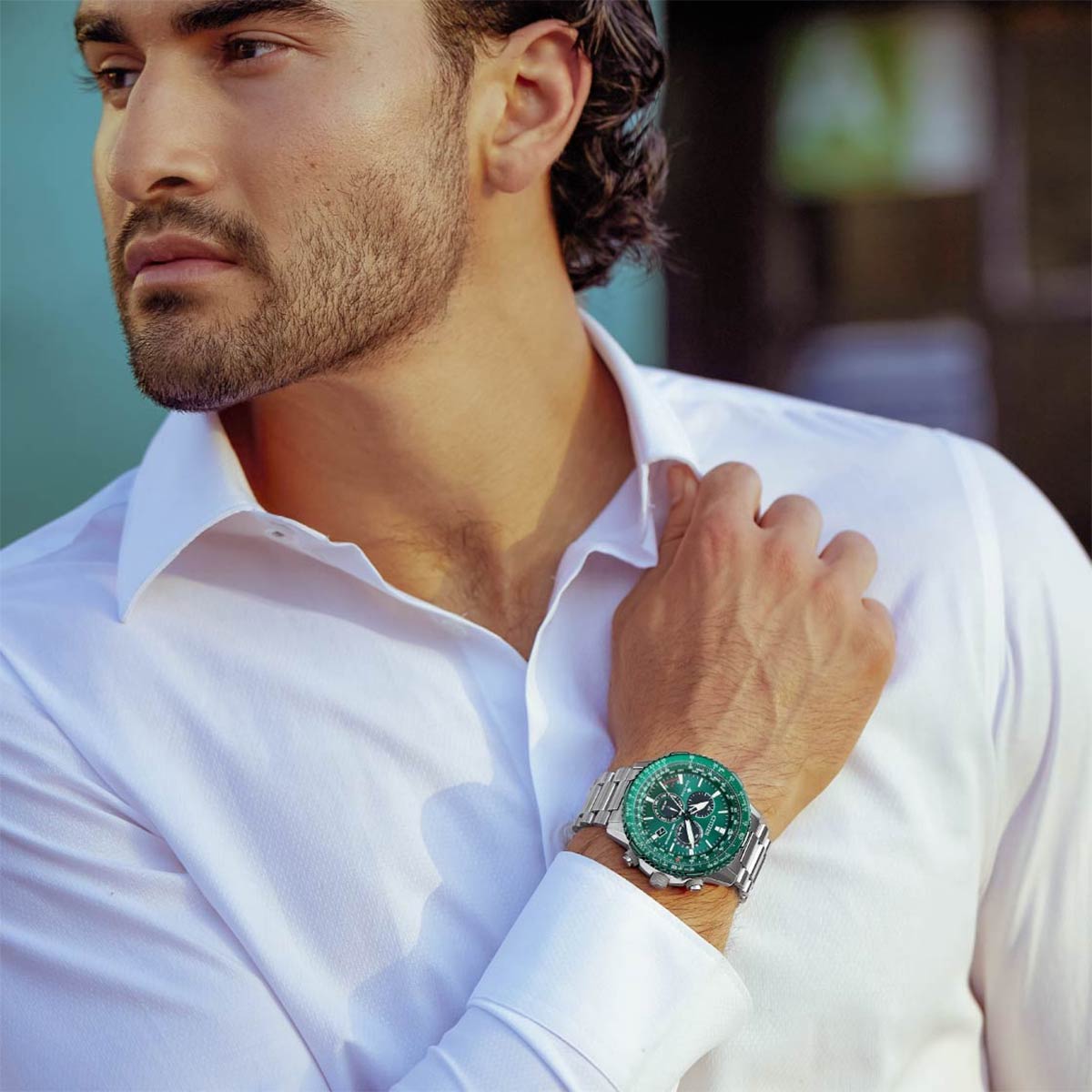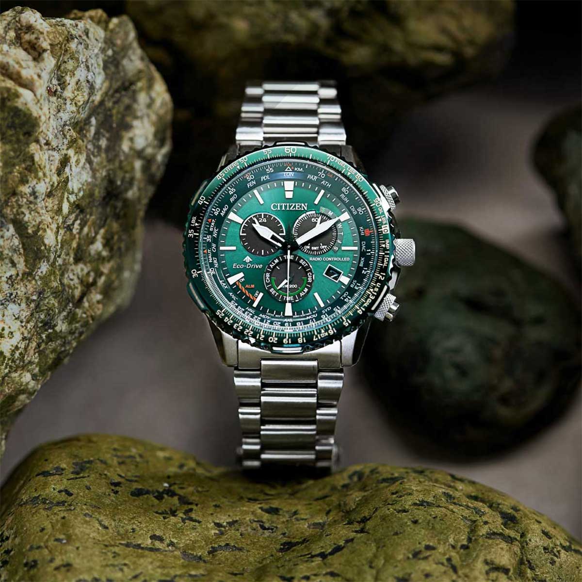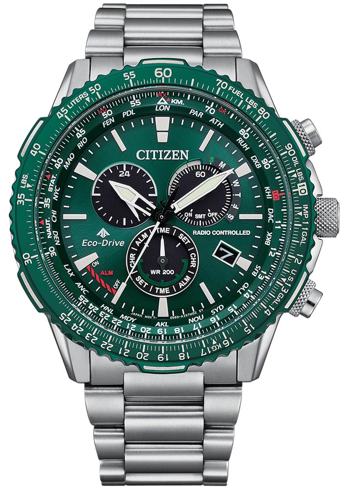Kultovní hodinky Citizen Promaster Sky Radio Controlled CB5004-59W v nejnovější verzi. Sportovní náramek a masivní pouzdro z nerezové oceli. Pouzdro o průměru 45,9 mm je nahoře zdobeno otočnou lunetou se stupnicí pro výpočet množství paliva v nádrži letadla s dalšími barvami, zelenou a bílou, které odkazují na číselník. Toto příslušenství nemusí být na souši příliš užitečné, ale dodává jedinečný, silný design. Třída těsnosti 20 barů vám umožní potápět se a dobýt podmořský svět.