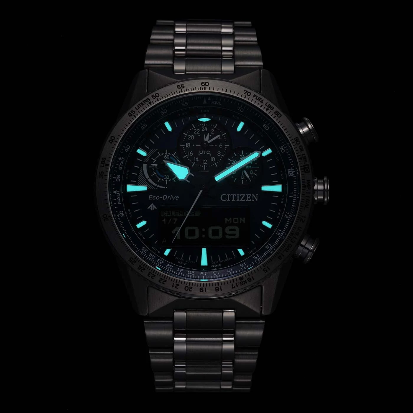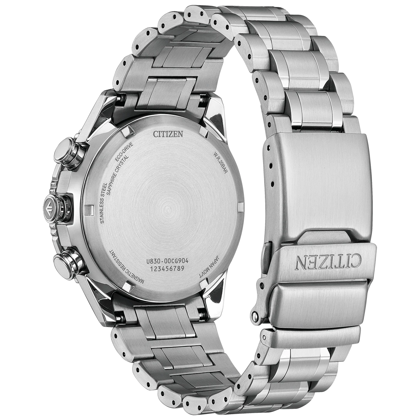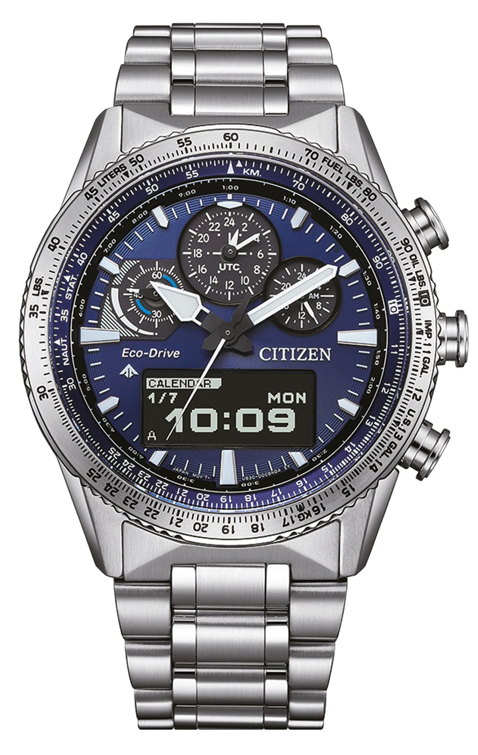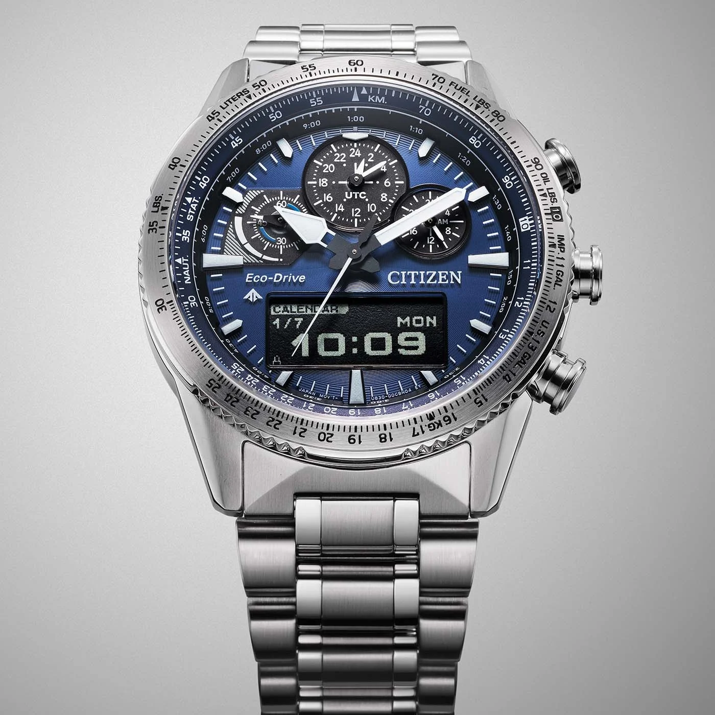 Pouzdro o průměru 43 mm je vyrobeno z masivní ušlechtilé oceli, kterou kryje antireflexní safírové sklo. To chrání intenzivně modrý číselník a digitální displej MIP – novou technologii zajišťující špičkovou čitelnost i na ostrém slunci. Umožňuje navíc zobrazování detailních údajů, od indikátoru intenzity světla napájejícího systém Eco-Drive, až po pokročilé funkce světového času.