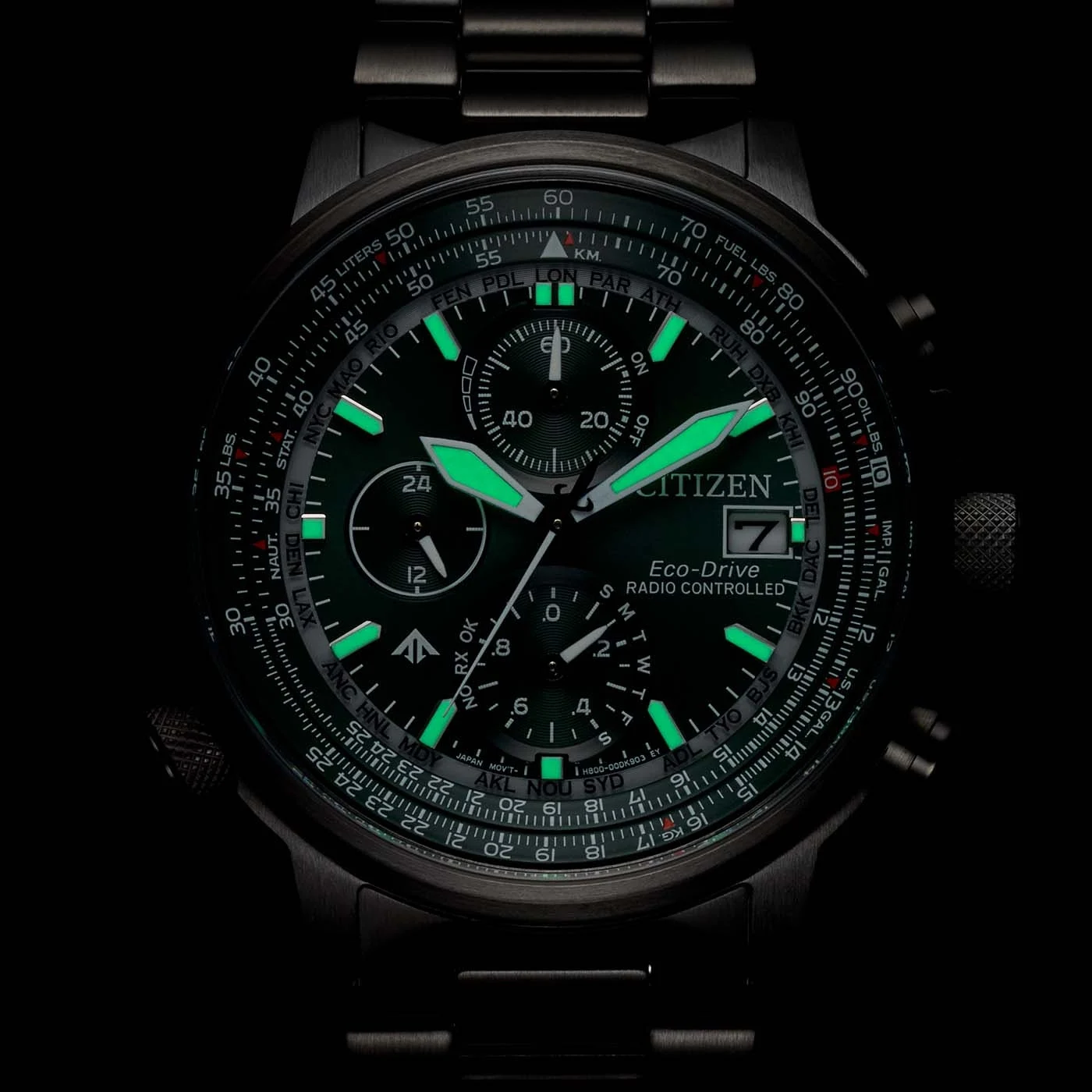 Citizen Promaster Sky AT8304-57W jsou hodinky, které vynikají nejen technologií, ale také odvážným a moderním designem. Zelený číselník v hlubokém odstínu skvěle kontrastuje s pouzdrem a náramkem v barvě Gun – tmavě šedém, téměř černém povrchu s mimořádnou tvrdostí a odolností proti poškrábání. Toto spojení dodává hodinkám sportovní eleganci a zdůrazňuje jejich letecký charakter.