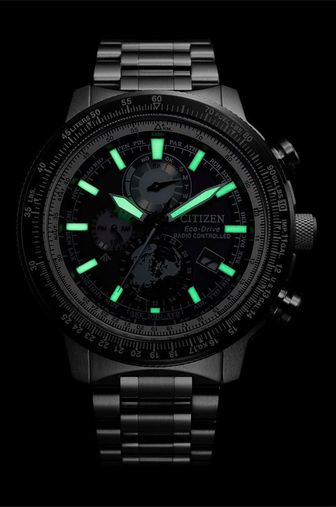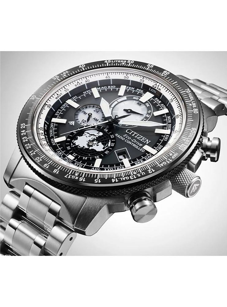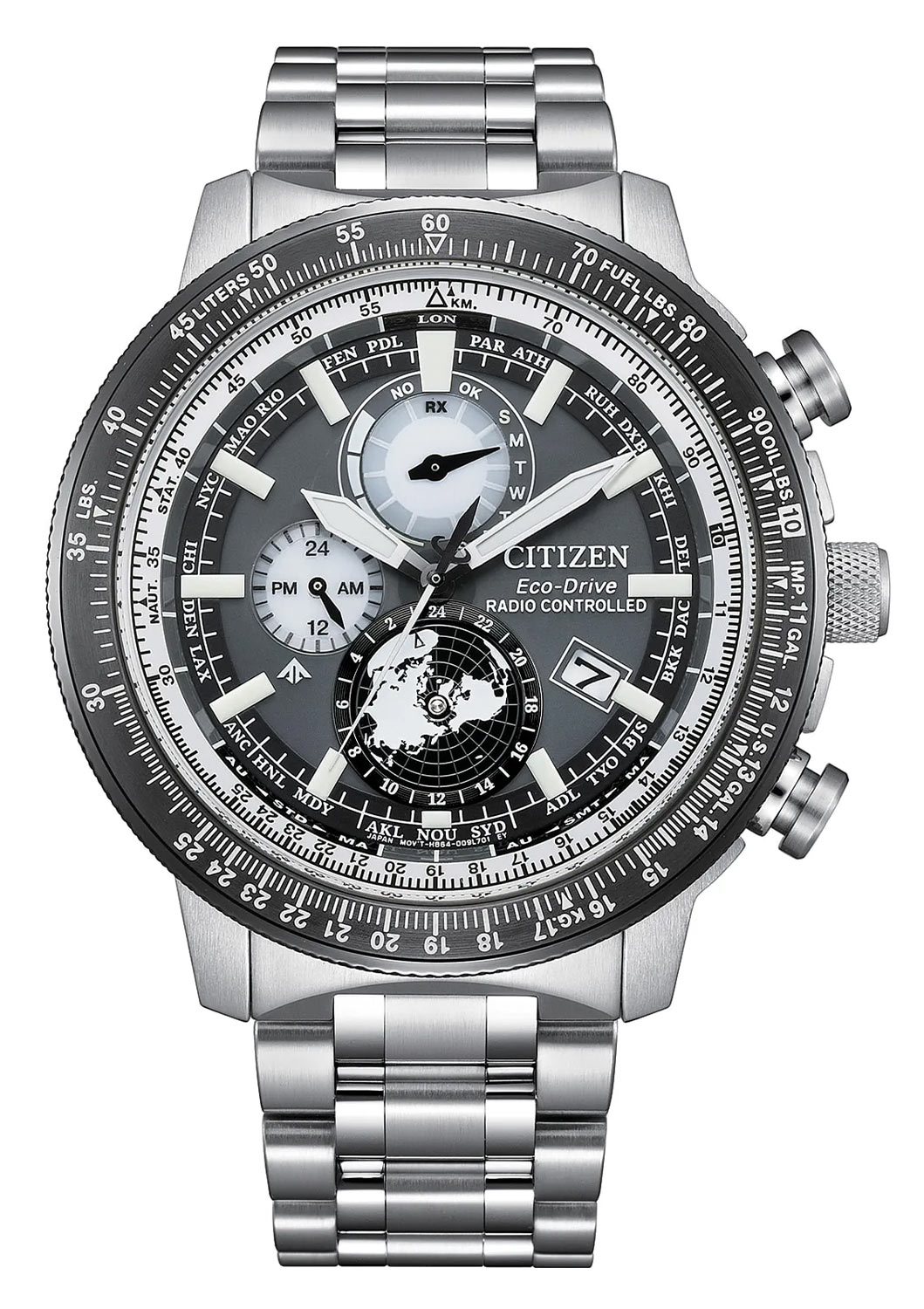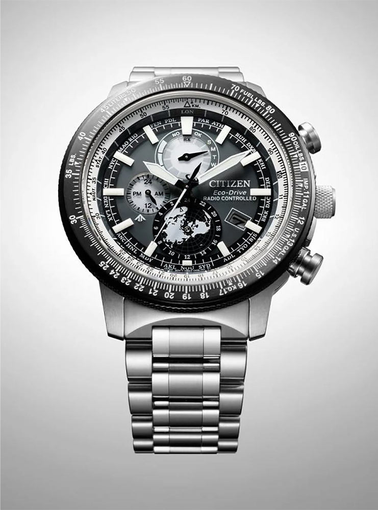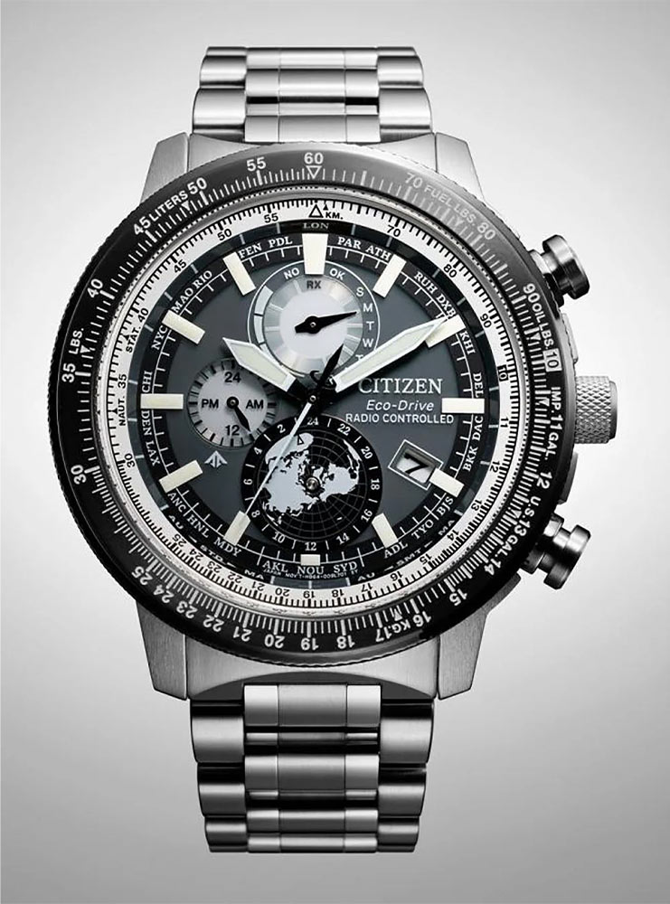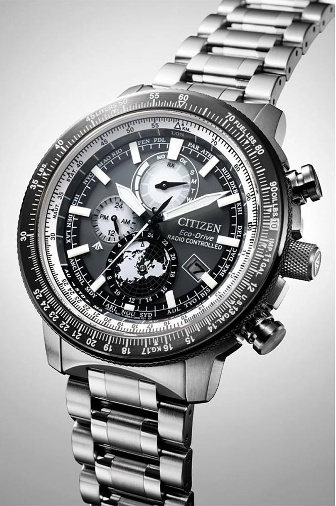Odolné proti poškrábání safírové sklo chrání ciferník před poškozením. Na přední straně pouzdra je černý kroužek se stupnicí pro kontrolu spotřeby paliva — jedná se o mimořádně užitečnou funkci, například pro piloty. Šedý ciferník hodinek Citizen se může pochlubit velkou funkčností. Na něm jsou subdialy pro kontrolu a sledování funkcí jako je stopky, perpetualní kalendář, 12/24h čas, světový čas, indikátor stavu nabití baterie a datumovka. Ve slabých světelných podmínkách ciferník osvětluje luminiscenční hmota.