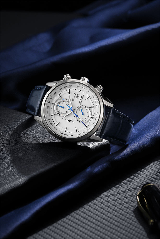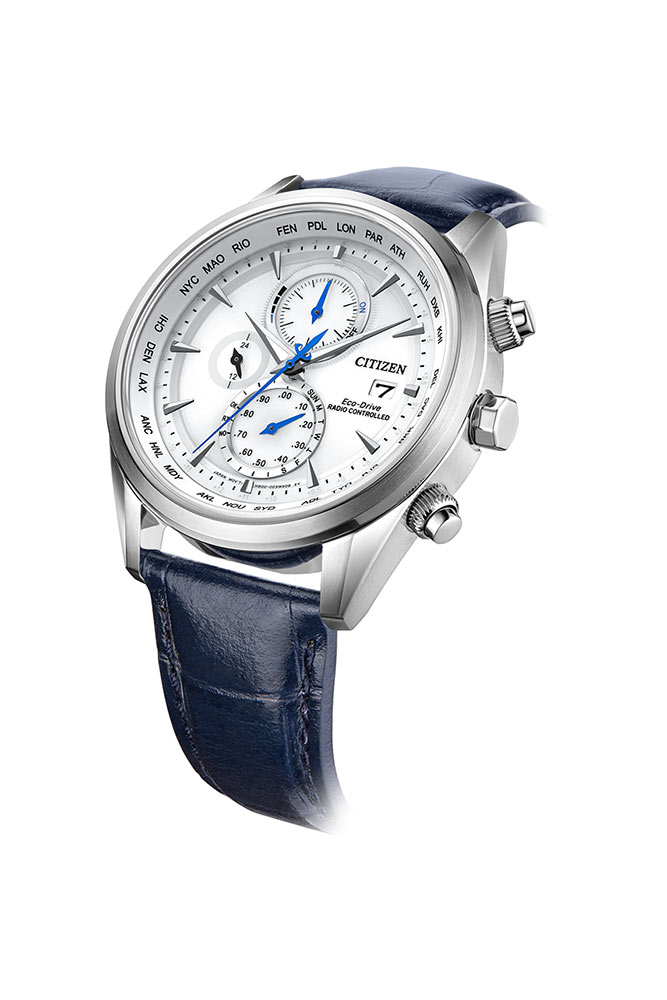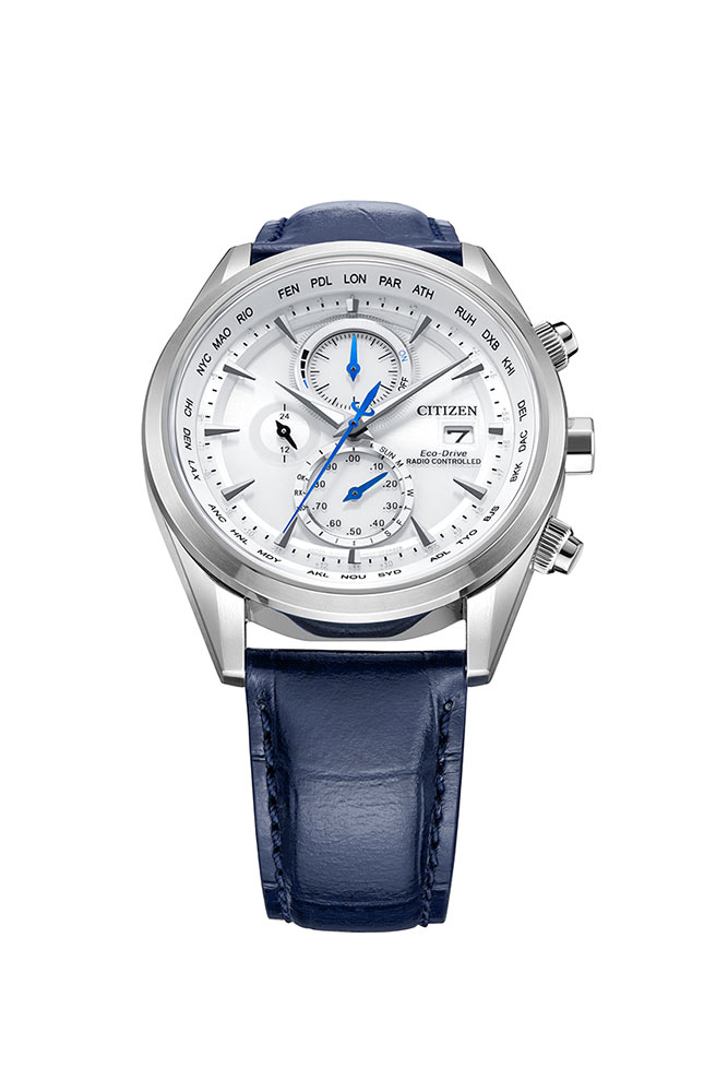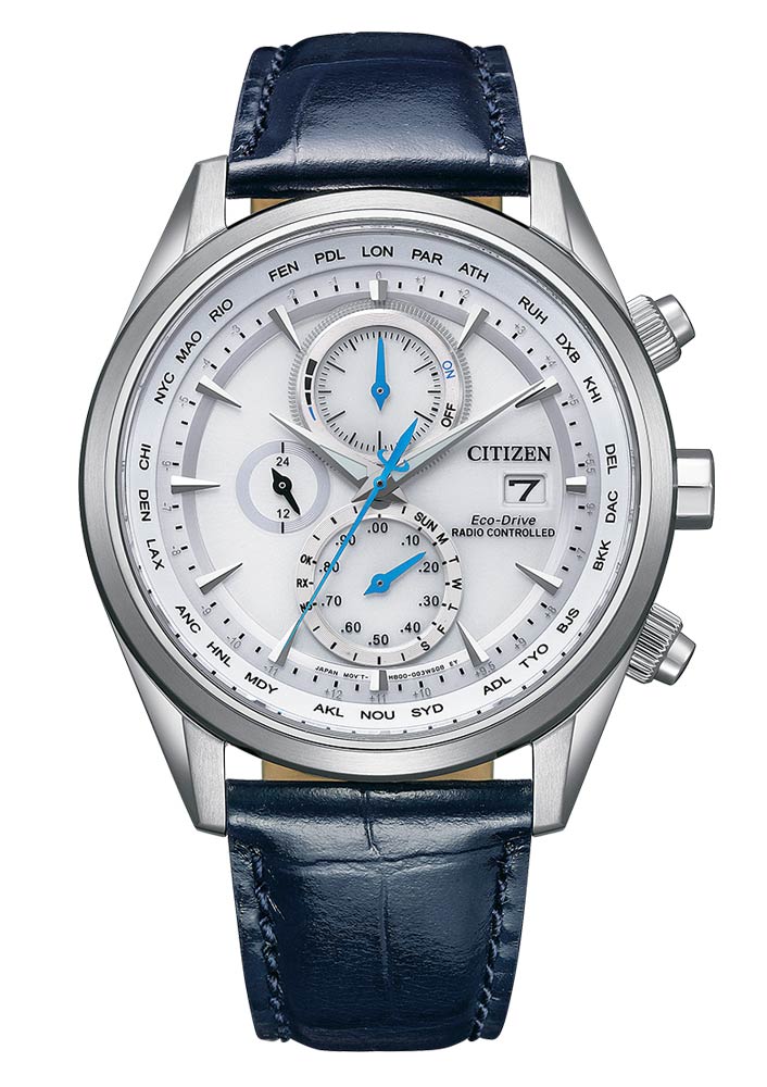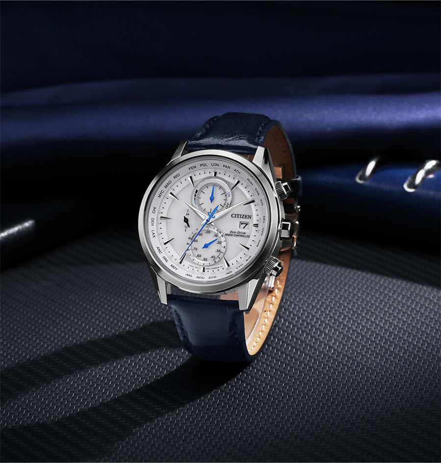 Japonské hodinky řízené rádiem Citizen jsou multifunkčním doplňkem na zápěstí pro profesionálně aktivní muže a sportovce. Pod tvrdým safírovým sklíčkem je bílý ciferník s funkcí chronografu. Mužům se bude hodit chronograf pro sledování přesného času například při cvičení. Hodinky jsou vybaveny několika dalšími užitečnými funkcemi. Vnitřní část štítu obsahuje zkratky až 26 měst po celém světě. Hodinky Citizen Radio Controlled vám pomohou sledovat světový čas, což se bude hodit všem mužům, jejichž život zahrnuje cestování. Věčný kalendář na rádiem řízeném chronografu Citizen je funkce kalendáře, kterou není třeba ručně upravovat. Kalendář na vašich hodinkách Citizen bude poskytovat přesné zobrazení data až do přibližně 2100. Hodinky Citizen umožňují odečítat aktuální den v měsíci a den v týdnu. Na deváté hodině je subciferník s 12/24hodinovým zobrazením času.