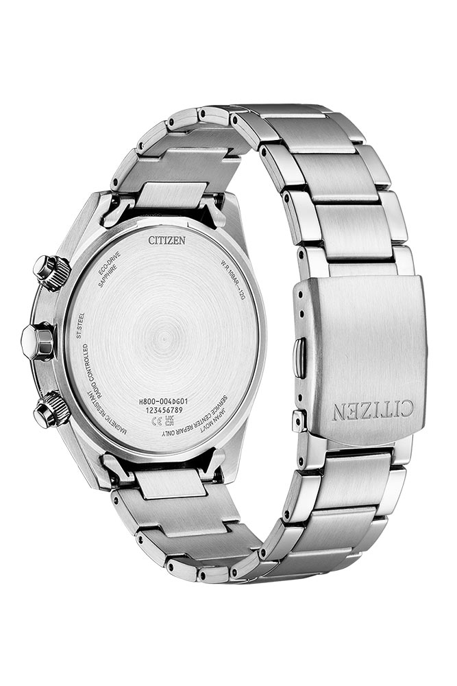 Pánské hodinky Citizen Radio Controlled Chronograph jsou kulaté pouzdro vyrobené z nerezové oceli třídy 316L odolné proti korozi. Nerezová ocel se vyznačuje mimořádnou životností a odolností vůči vnějším faktorům, díky čemuž je ideální volbou pro každodenní použití. Na pravé straně pouzdra jsou tradičně umístěna funkční tlačítka a korunka. Hodinky Citizen Radio Controlled 43mm chronograf jsou spárovány s ocelovým náramkem stříbrné barvy. Náramek bezpečně obepne zápěstí a zaručí to motýlkové zapínání se dvěma knoflíky.