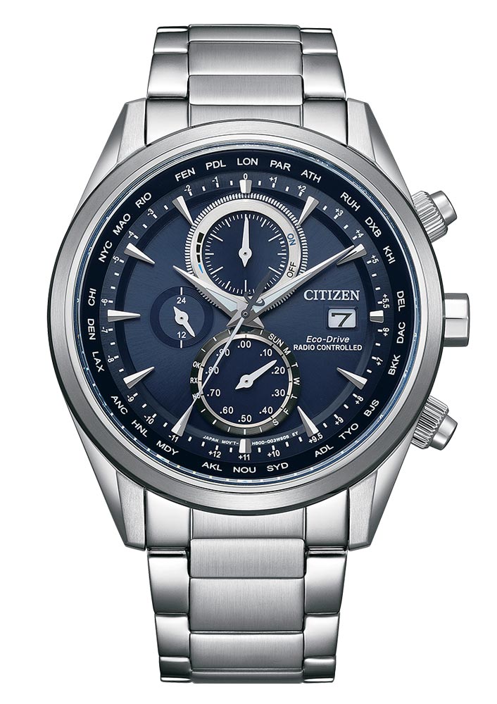 Japonský rádiem řízený časovač Citizen je multifunkční příslušenství na zápěstí pro profesionálně aktivní muže a sportovce. Pod tvrdým safírovým sklíčkem je umístěn modrý ciferník s funkcí chronografu. Mužům se bude chronograf hodit ke sledování přesného času například při cvičení. Hodinky jsou vybaveny několika dalšími užitečnými funkcemi. Na vnitřní straně štítu jsou zkratky až 26 měst z celého světa. Hodinky Citizen Radio Controlled vám pomohou sledovat světový čas, což se bude hodit všem pánům, jejichž životem je cestování. Věčný kalendář na hodinkách Citizen Radio Controlled Chronograph je funkce kalendáře, kterou není třeba ručně upravovat. Kalendář na hodinkách Citizen bude poskytovat přesné zobrazení data až do roku 2100. Hodinky od značky Citizen umožňují odečíst aktuální den v měsíci i den v týdnu. Na deváté hodině je subciferník s 12/24hodinovým zobrazením času.