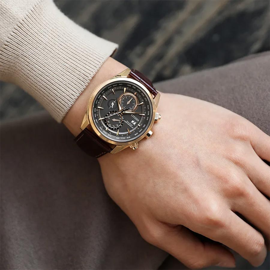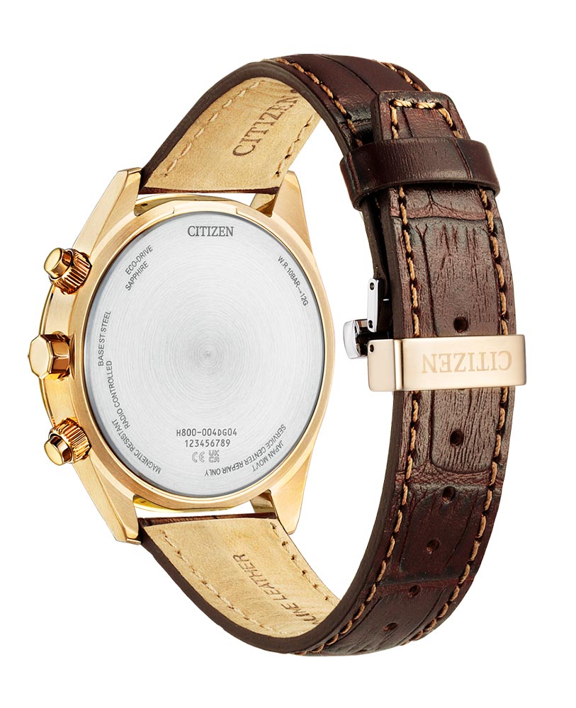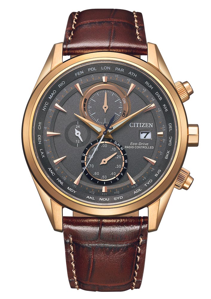 Pánské hodinky Citizen Radio Controlled Chronograph mají kulaté pouzdro vyrobené z nerezové oceli 316L odolné proti korozi v růžovém zlatě PVD. Nerezová ocel se vyznačuje mimořádnou životností a odolností vůči vnějším faktorům, díky čemuž je ideální volbou pro každodenní použití. Funkční tlačítka a korunka jsou tradičně umístěny na pravé straně pouzdra. Hodinky Citizen Radio Controlled s chronografem o velikosti 43 mm jsou spárovány s měkkým, pohodlným a elegantním hnědým řemínkem z přírodní kůže. Řemínek se bezpečně obepne kolem vašeho zápěstí díky motýlkové sponě na dva knoflíky.