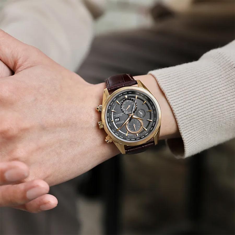 Japonské hodinky řízené rádiem Citizen jsou multifunkčním doplňkem na zápěstí pro profesionálně aktivní muže a sportovce. Pod tvrdým safírovým sklíčkem je šedý ciferník s funkcí chronografu. Mužům se bude hodit chronograf pro sledování přesného času například při cvičení. Hodinky jsou vybaveny několika dalšími užitečnými funkcemi. Vnitřní část štítu obsahuje zkratky až 26 měst po celém světě. Hodinky Citizen Radio Controlled vám pomohou sledovat světový čas, což se bude hodit všem mužům, jejichž život zahrnuje cestování. Věčný kalendář na rádiem řízeném chronografu Citizen je funkce kalendáře, kterou není třeba ručně upravovat. Kalendář na vašich hodinkách Citizen bude poskytovat přesné zobrazení data až do přibližně 2100. Pozlacené hodinky značky Citizen umožňují odečíst aktuální den v měsíci a den v týdnu. Na deváté hodině je subciferník s 12/24hodinovým zobrazením času.